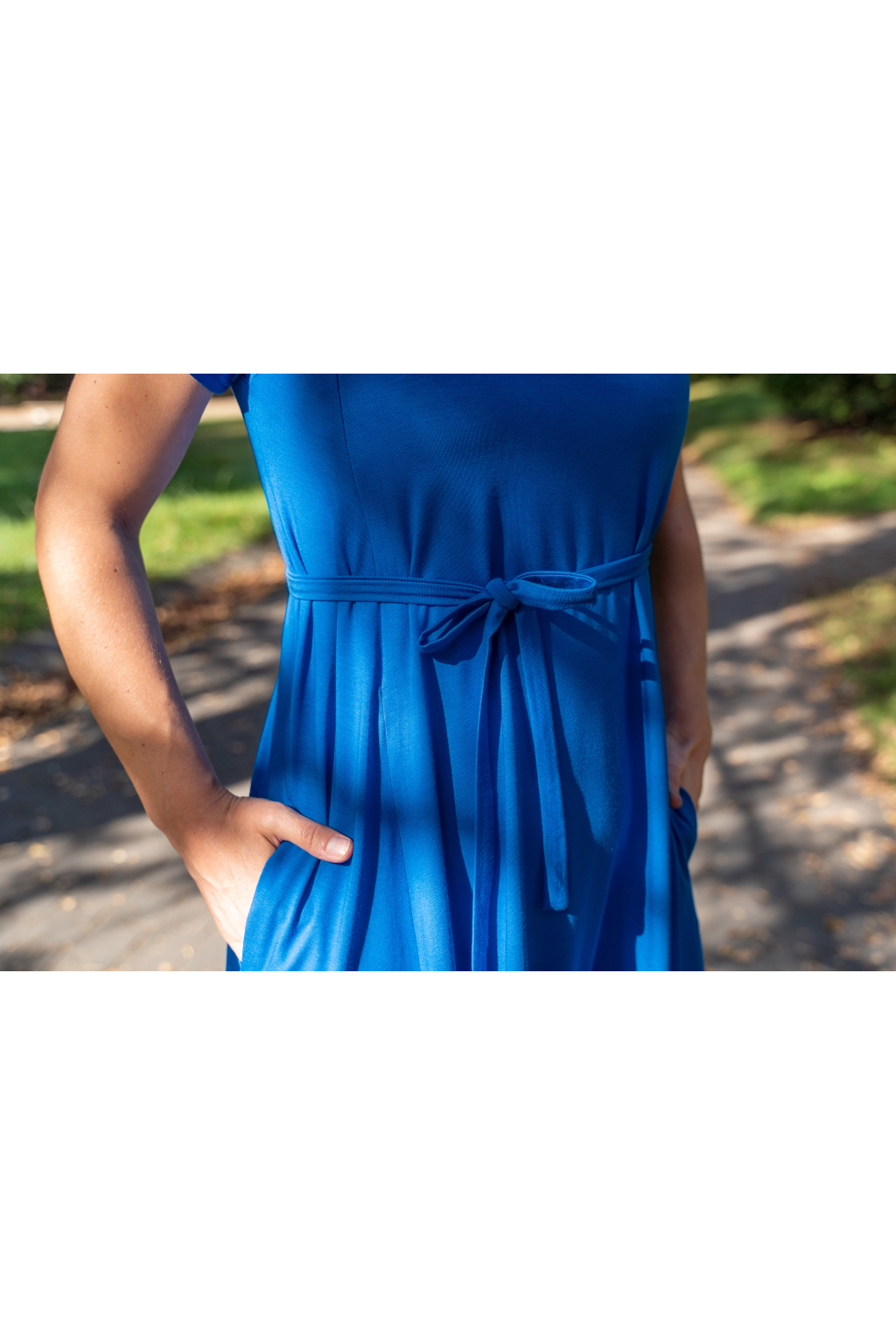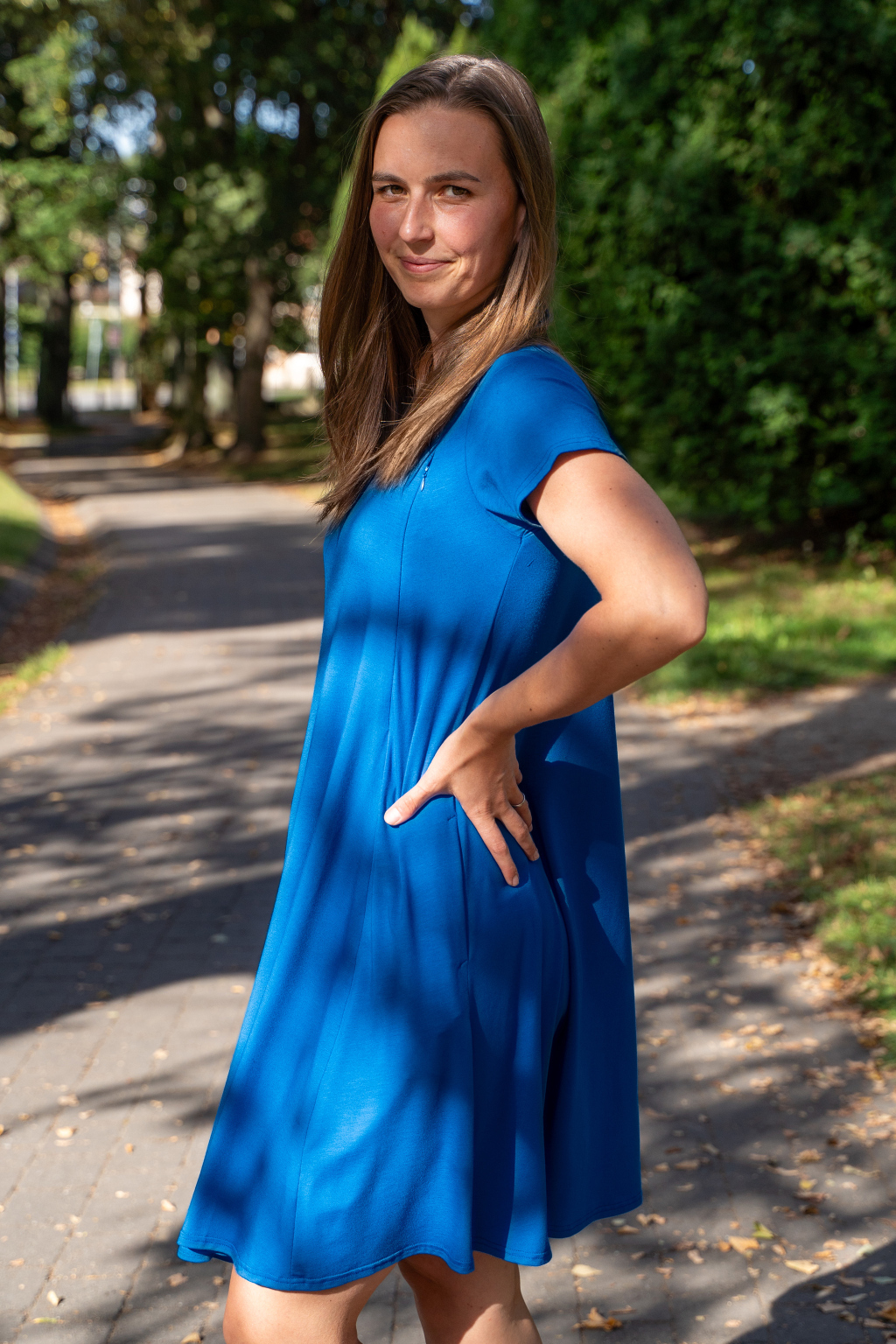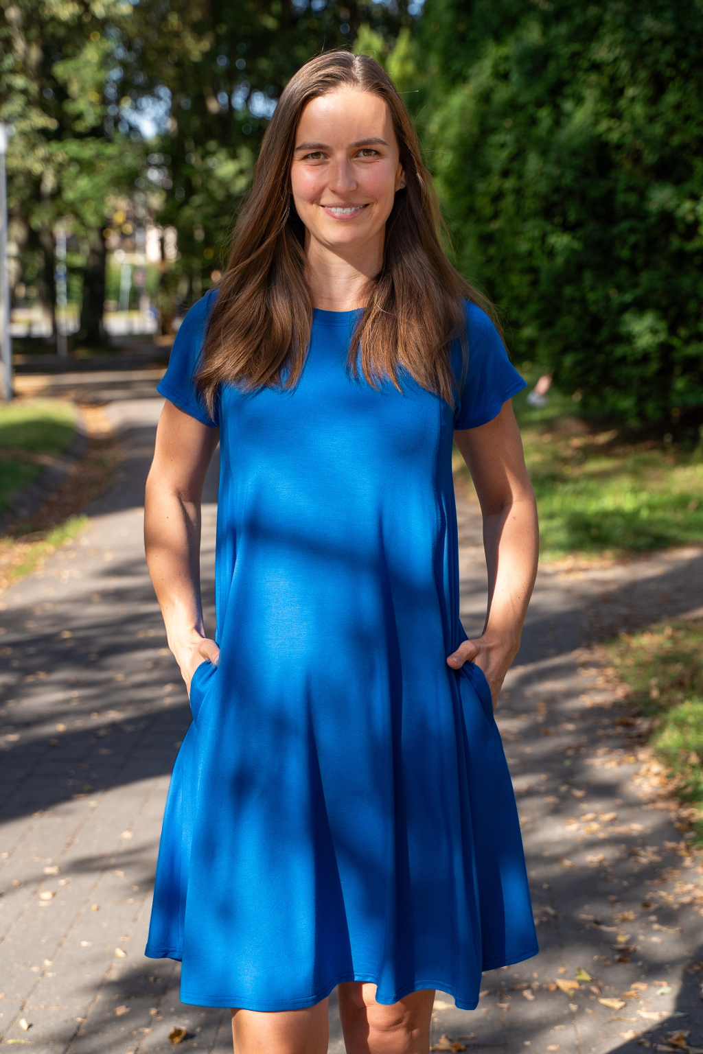 Šaty mají hluboké kapsy skryté ve švech, krátký rukáv a délku v úrovni kolen – pokud jste vyšší, počítejte s délkou nad kolena, nižším ženám bude sukně sahat níže. A protože tento model šijeme tak, aby každý kousek seděl hned dvěma velikostem (viz velikostní tabulka), nemusíte si dělat hlavu s každou změnou na těle.