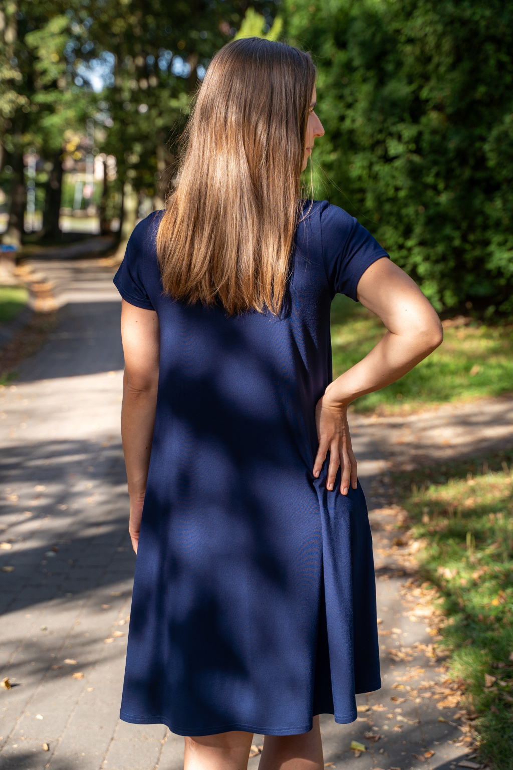 Šaty mají hluboké kapsy skryté ve švech, krátký rukáv a délku v úrovni kolen – pokud jste vyšší, počítejte s délkou nad kolena, nižším ženám bude sukně sahat níže. A protože tento model šijeme tak, aby každý kousek seděl hned dvěma velikostem (viz velikostní tabulka), nemusíte si dělat hlavu s každou změnou na těle.
