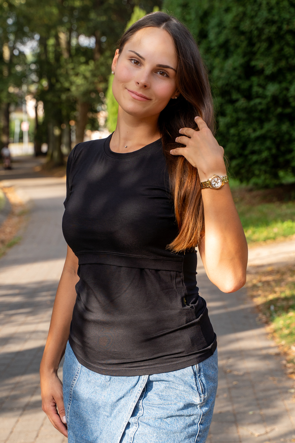 V každém dámském šatníku najdeme tzv. „malé černé šaty” na každou příležitost. Černá barva je univerzální, hodí se do společnosti i na volný čas, snadno se kombinuje, zeštíhluje, dokonale padne, snadno se zdobí šperky, skvěle maskuje pot a také je hrozně sexy! Přesně to, my ženy, v období těhotenství a kojení nutně potřebujeme! Stejné výhody samozřejmě platí i pro černé kojicí tričko. Když se k tomu přidá kvalitní bambus z české pletárny a precizní zpracování, nepostradatelný kousek je na světě.