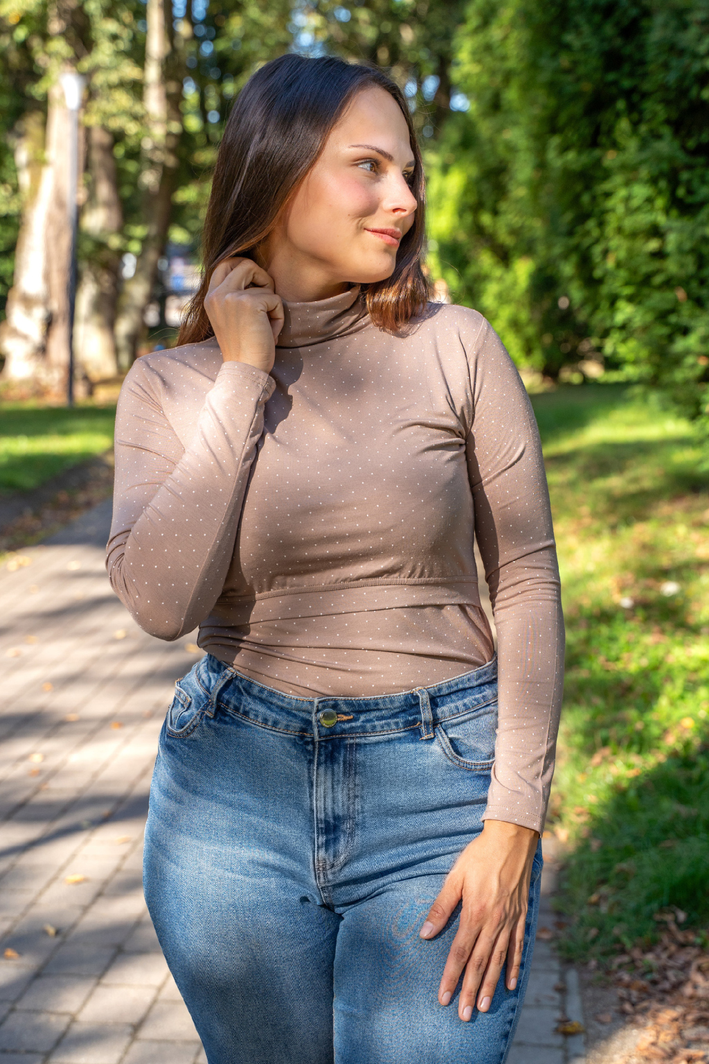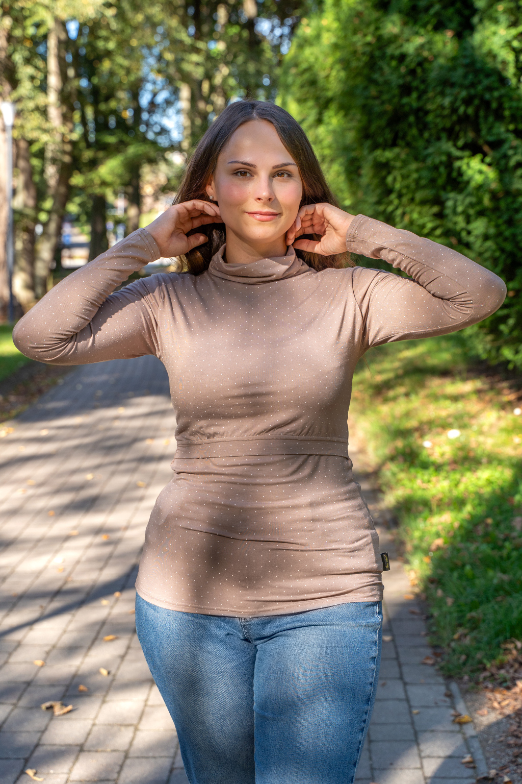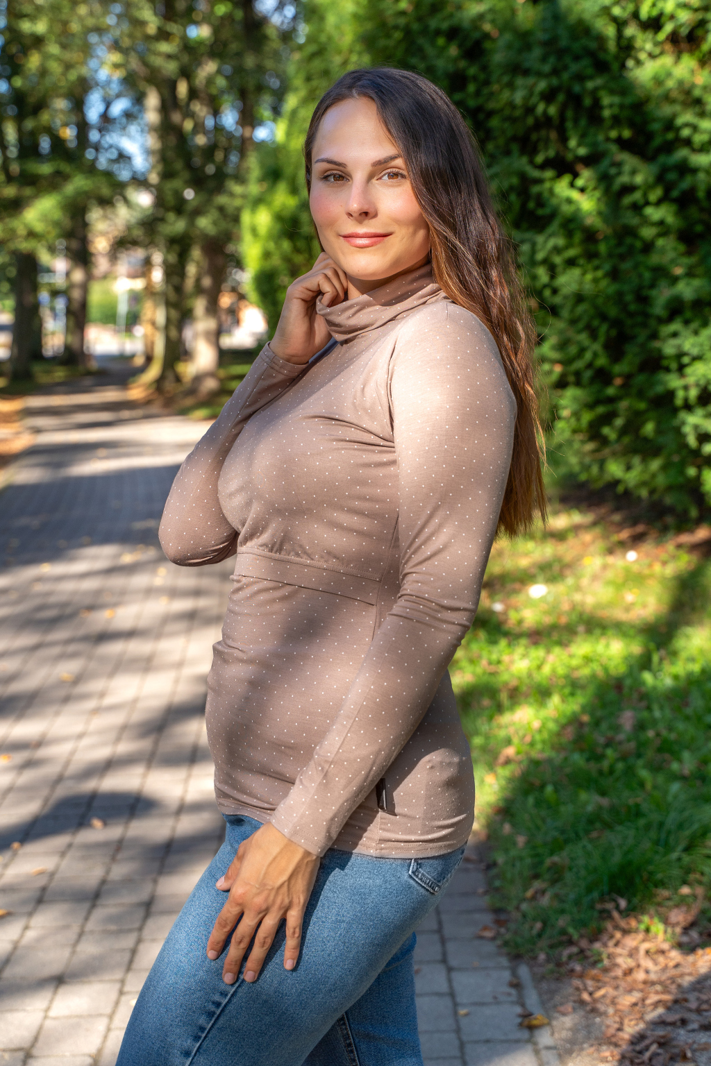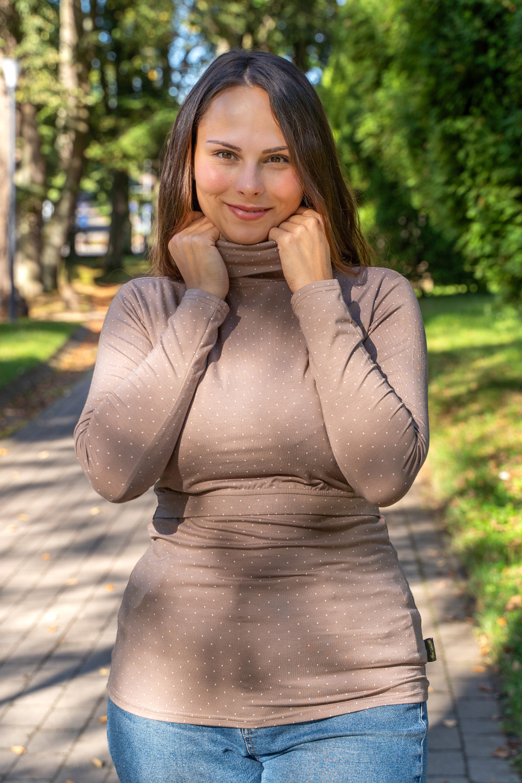 Náš kojicí rolák má projmutý střih a díky své pružnosti výborně sedí, takže dokáže vašemu těhotenskému či poporodnímu bříšku poskytnout dostatek pohodlí. Rolákové provedení (až ke krku) oceníte zvláště v zimních měsících, protože vám nebude foukat pod bundu.