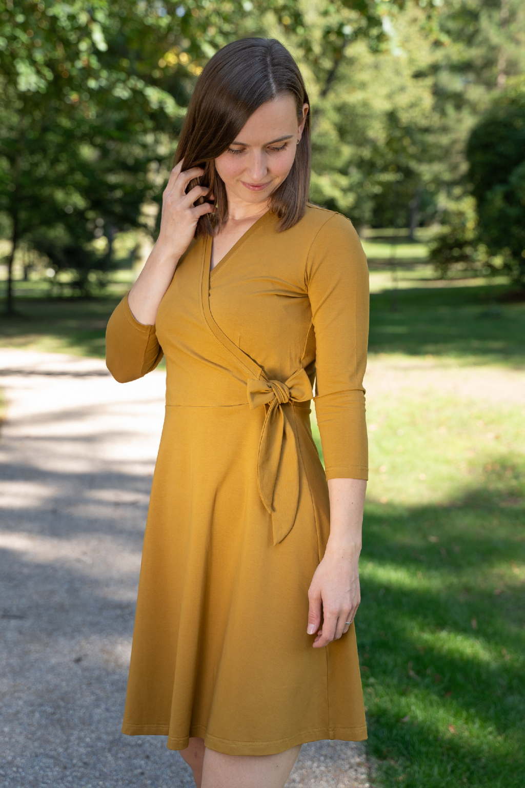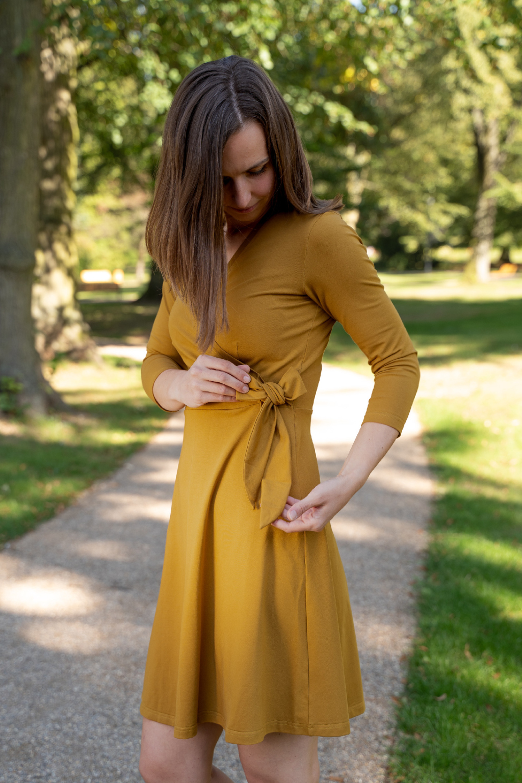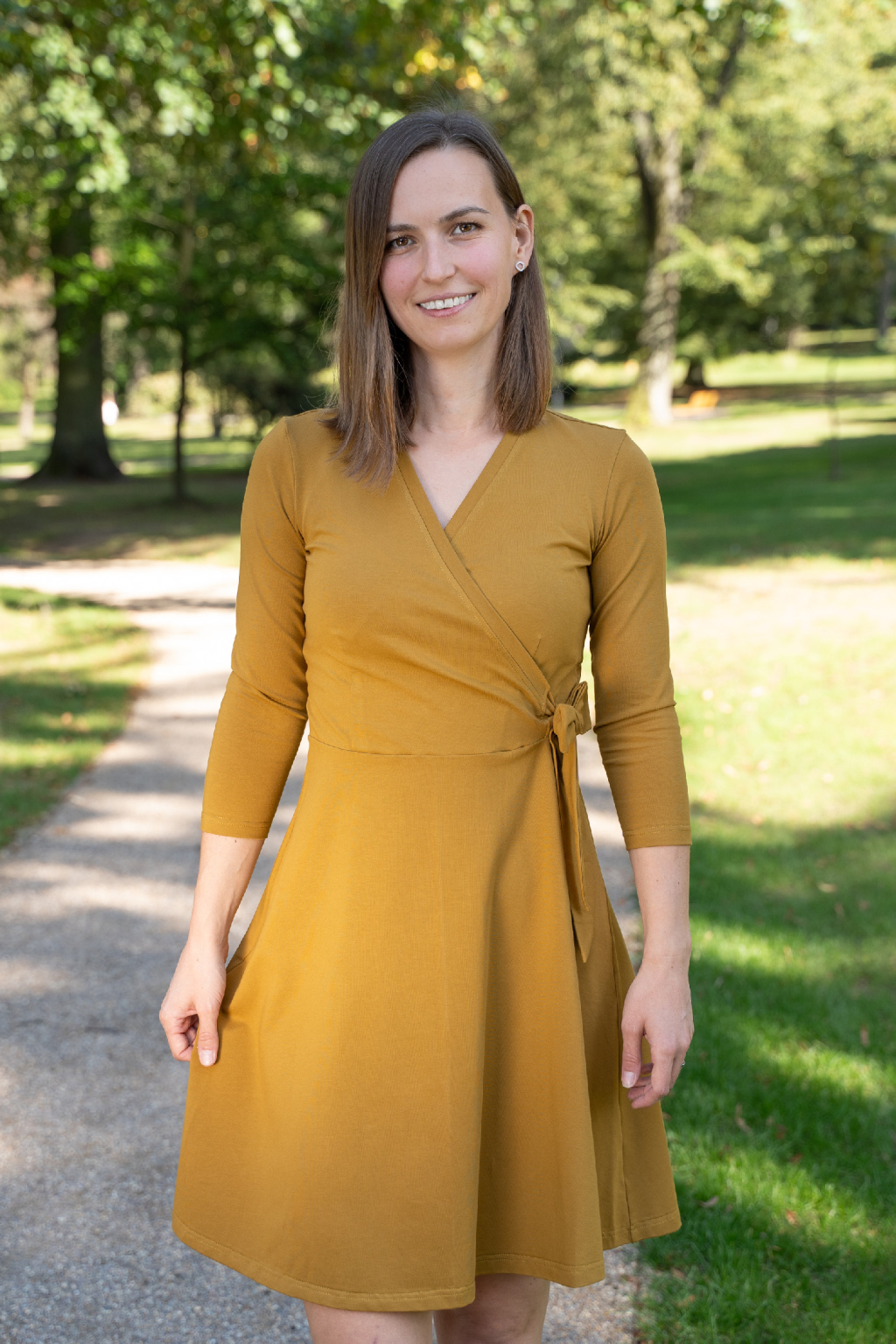 Podtrhněte své mateřství šaty v nenuceném okrovém odstínu! Model Loretta s 3/4 rukávy nemá žádné speciální kojicí vychytávky, a přesto v něm – díky hornímu zavinovacímu výstřihu a pružnému materiálu – svého malého drobečka nakojíte snadno a diskrétně. Kromě toho si zamilujete dotek BIO bavlny, která je jemná a úžasně heboučká.