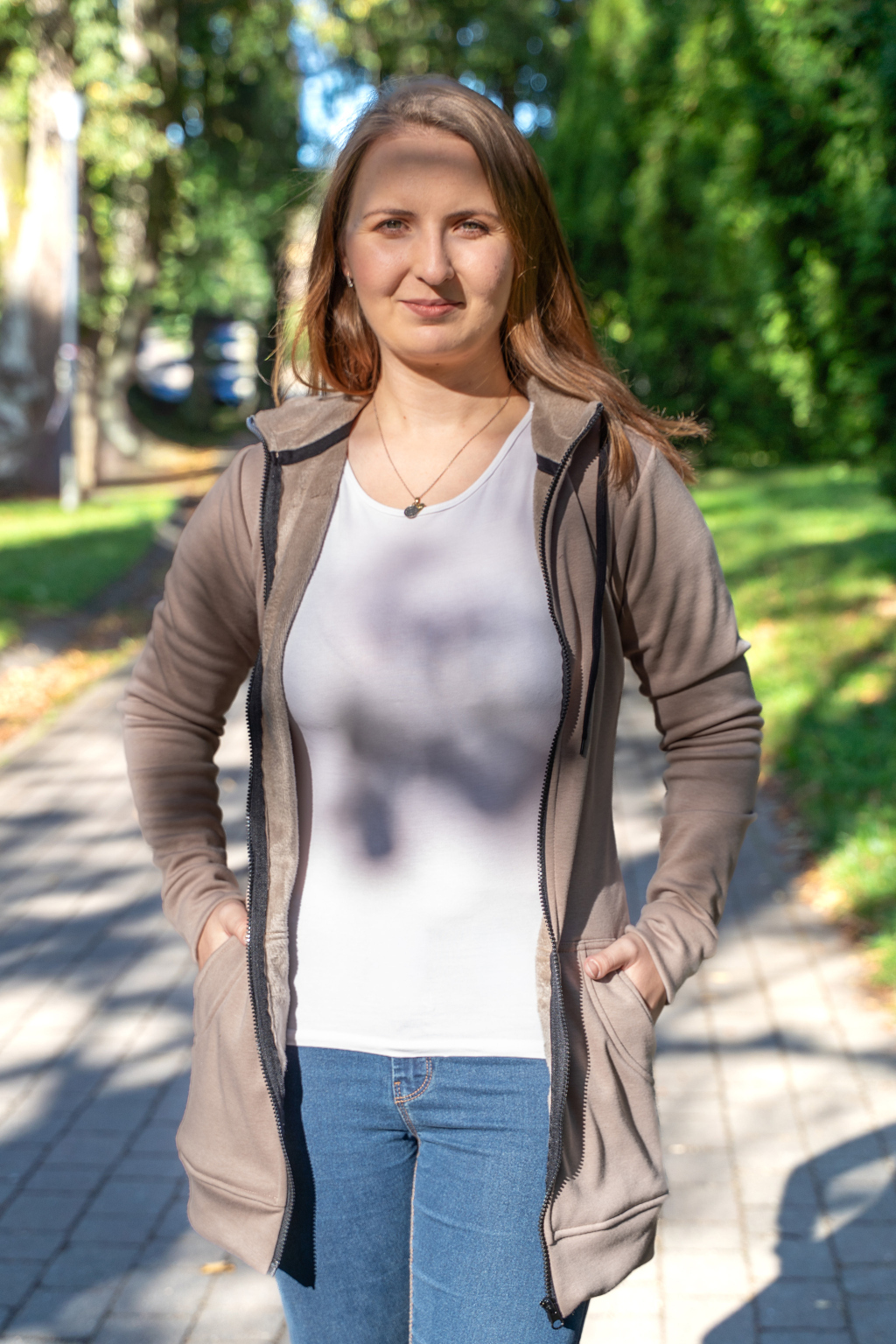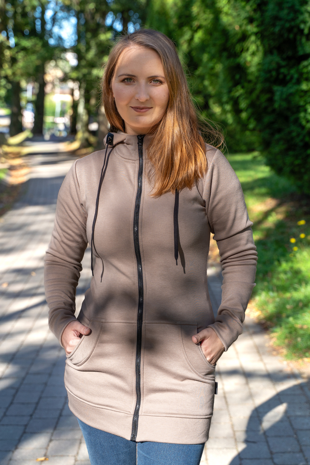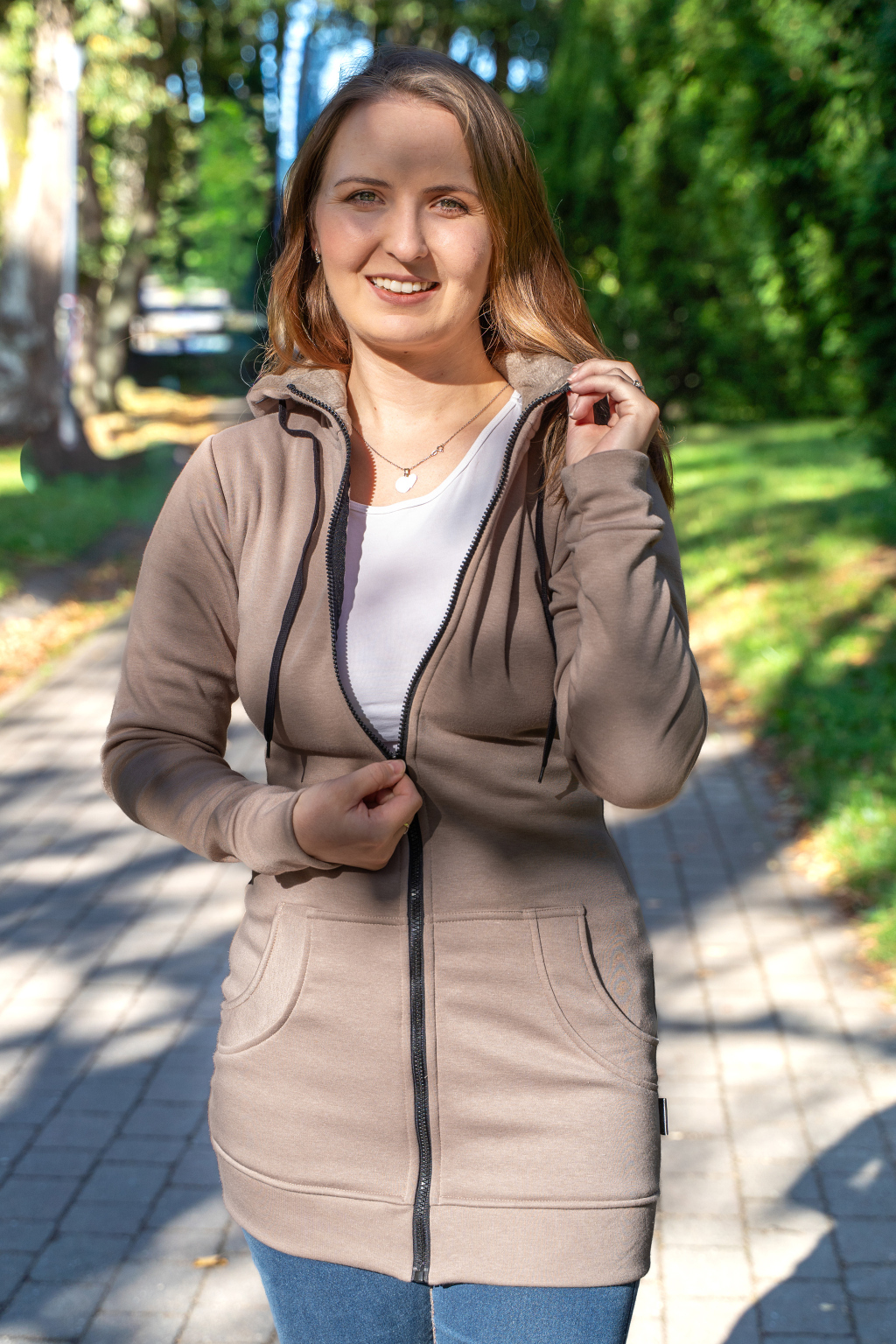 Dámská dlouhá mikina na zip s kapucí – béžová