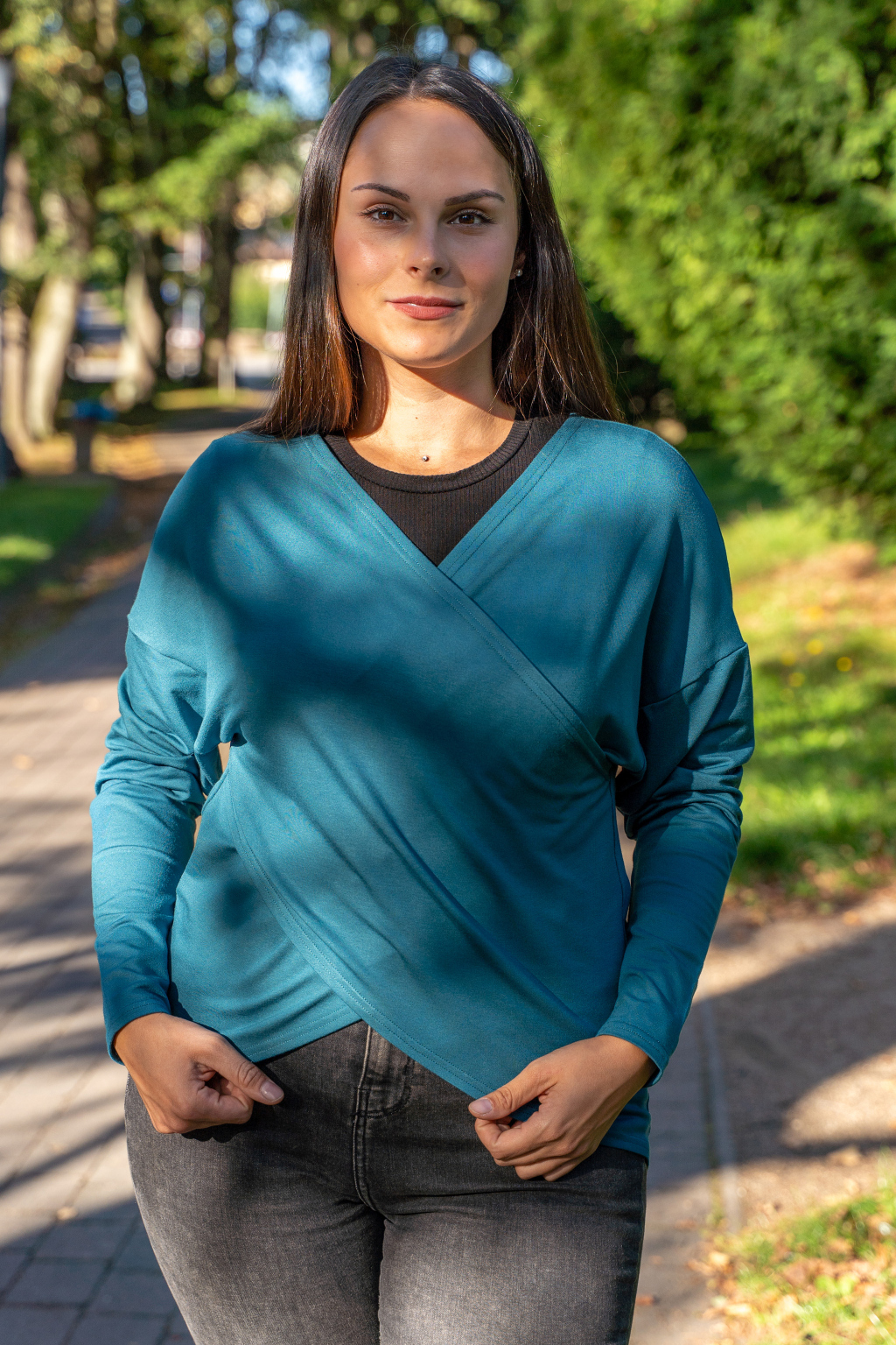Přestože tento dámský top nevypadá na první pohled jako kojicí, miminko v něm díky zavinovacímu střihu pohodlně nakojíte – bez nutnosti složitě manipulovat se zipy. Je to přirozené, jednoduché a praktické řešení, které ocení každá máma.