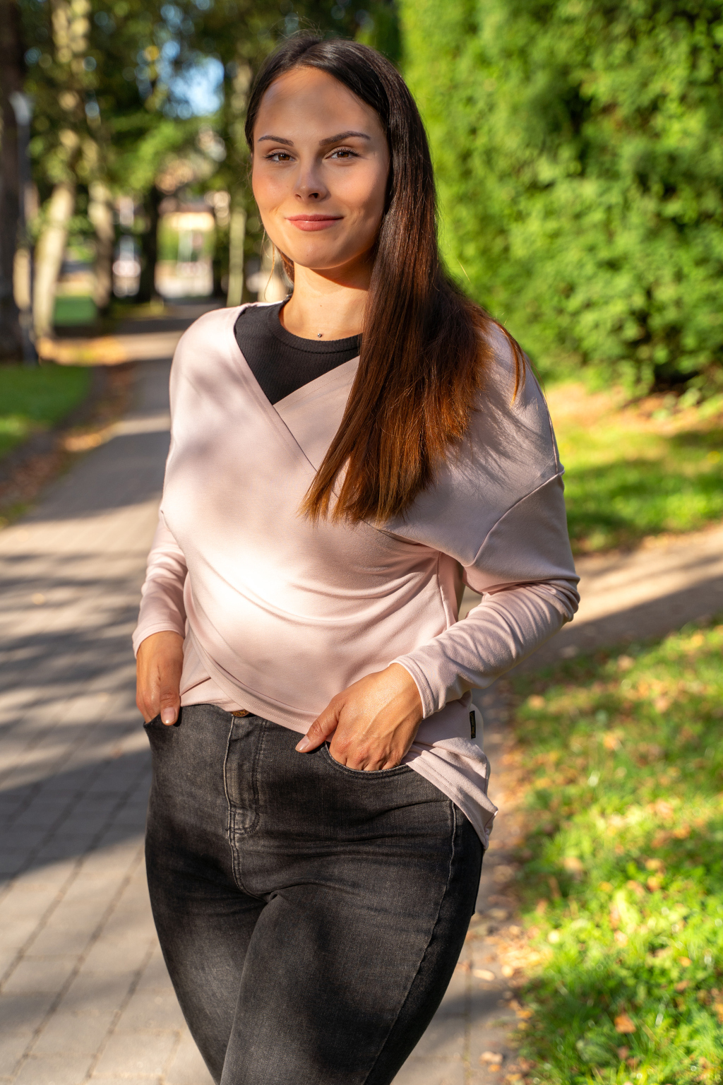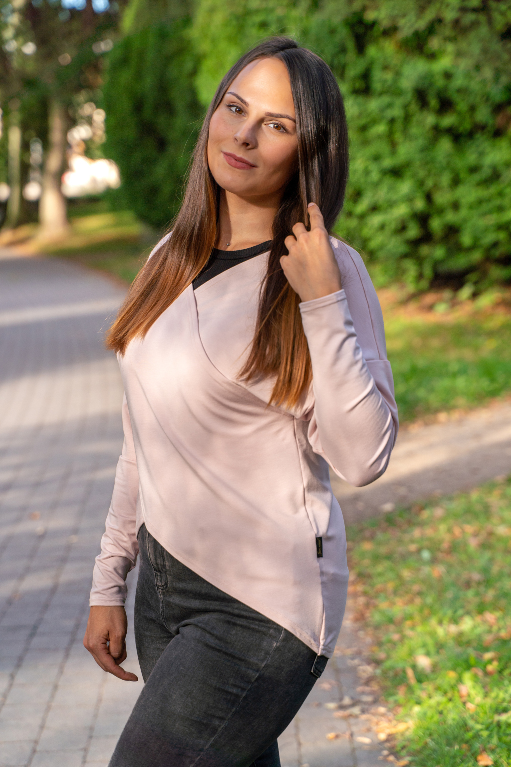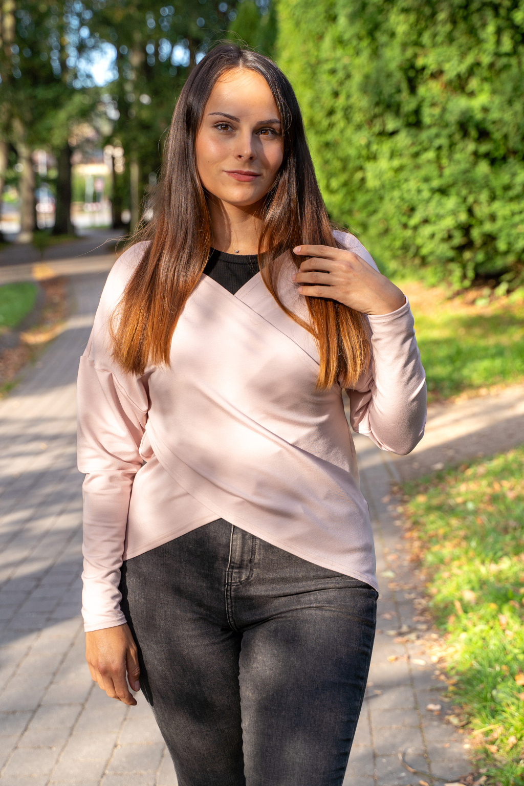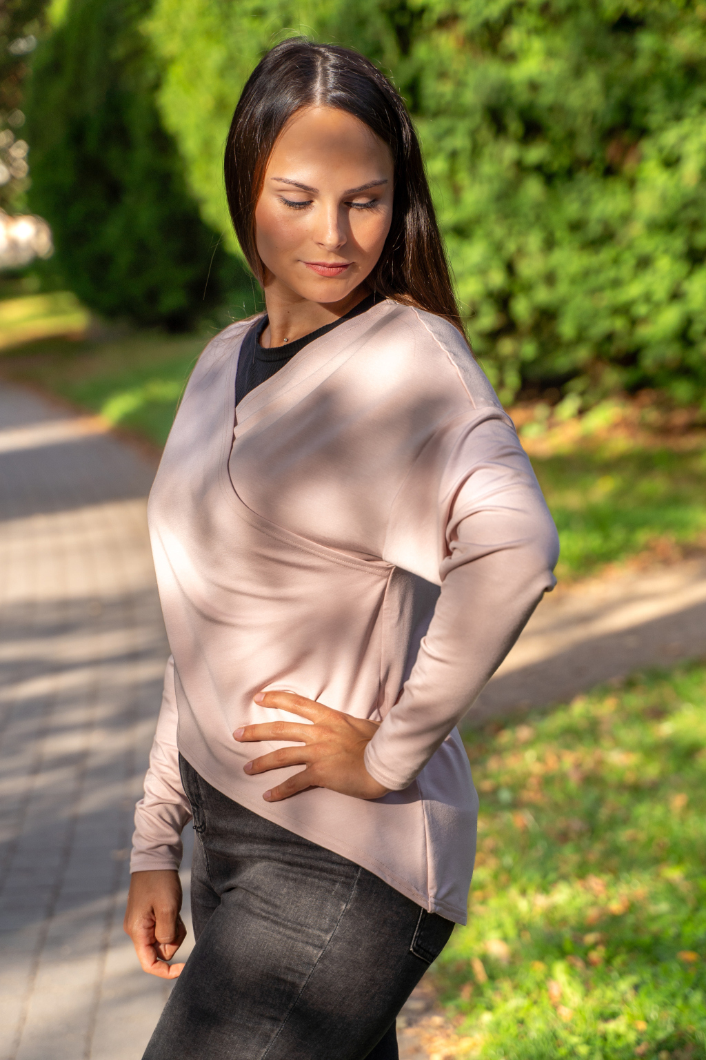 Přestože tento dámský top nevypadá na první pohled jako kojicí, miminko v něm díky zavinovacímu střihu pohodlně nakojíte – bez nutnosti složitě manipulovat se zipy. Je to přirozené, jednoduché a praktické řešení, které ocení každá máma.