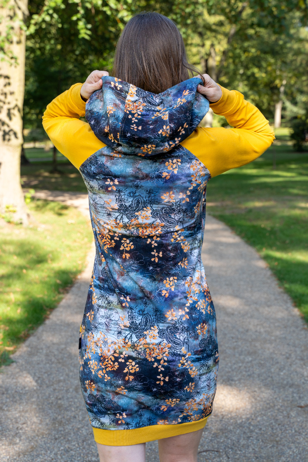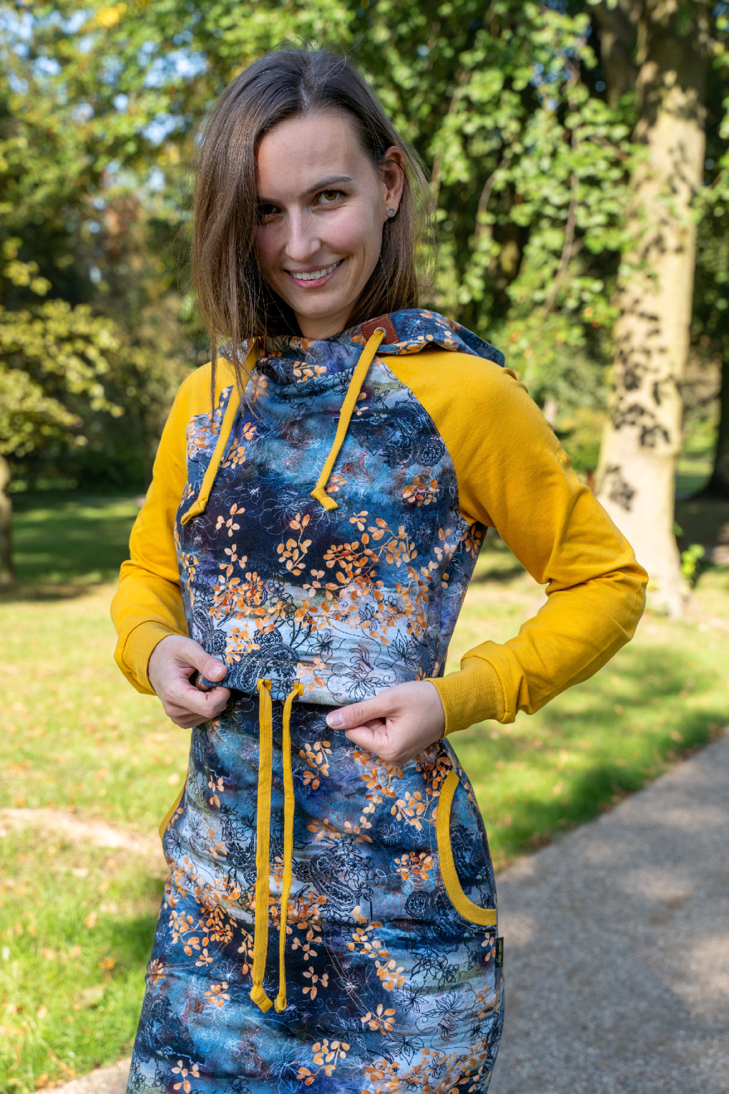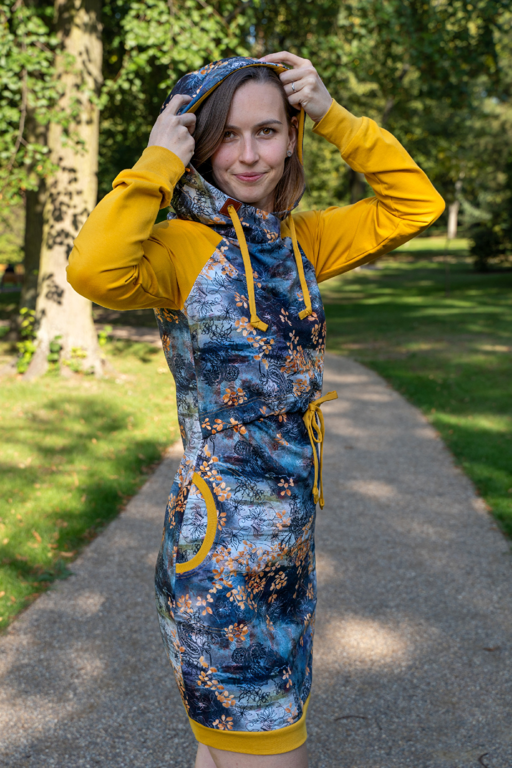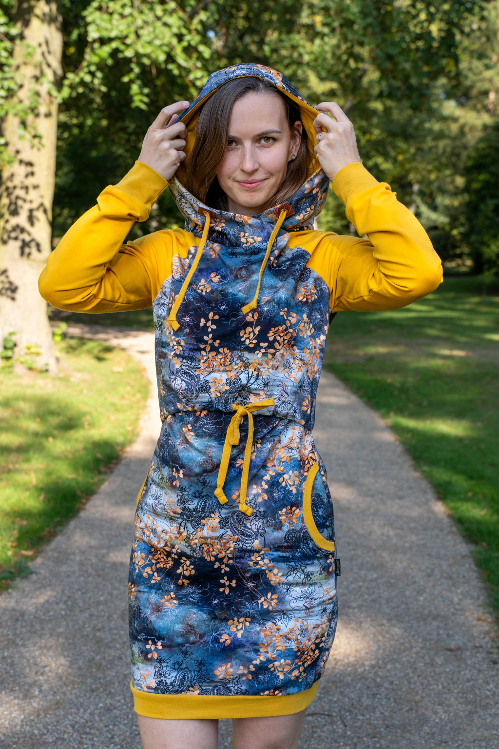 Mikinové šaty jsou do detailu promyšleny a sladěny do jednotného stylu. Mají velkou kapuci, kapsy a za povšimnutí stojí také barevné náplety či tkanice, které jsou sladěny k celkovému designu šatů. Tyto volnočasové šaty se hodí k teniskám i na sportovní aktivity, ale perfektně ladí také s balerínami a kabelkou.