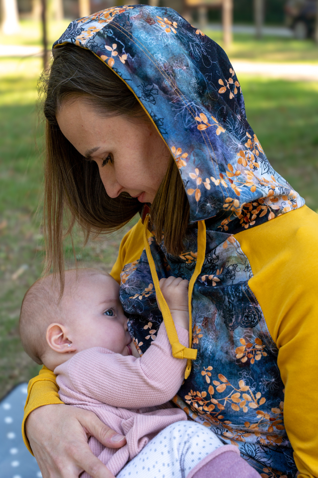 Kojení je zcela diskrétní díky dvojitému přednímu dílu, kdy se horní látka vyhrne nahoru a spodní naopak stáhne, čímž se vytvoří miminku potřebný prostor ke kojení. Horní díl šatů má pod prsy pružnou tkanici, která zabraňuje vytahání a následné odstávání namáhané části šatů.