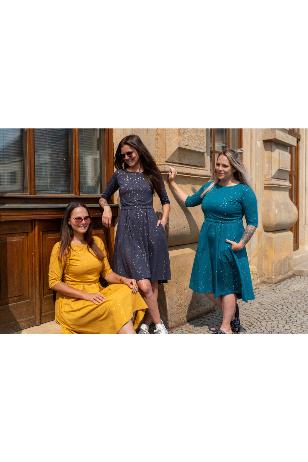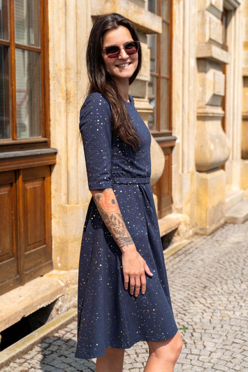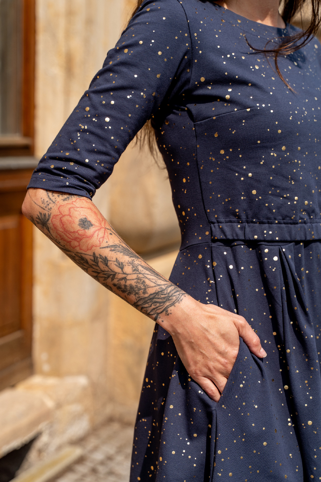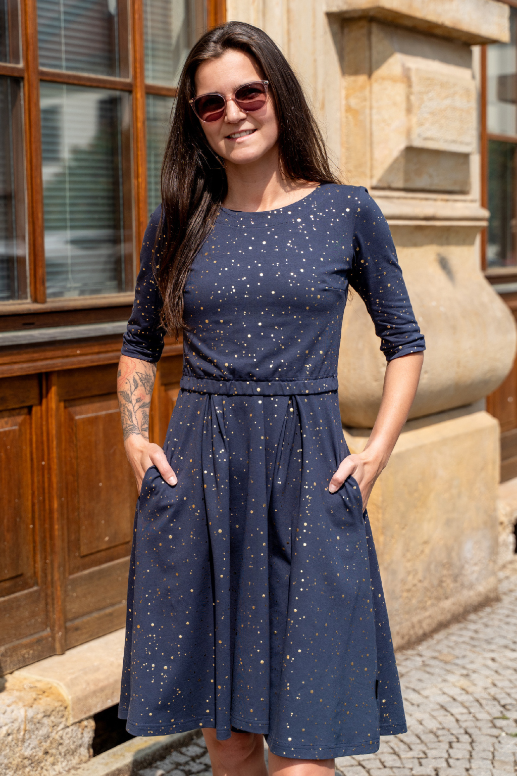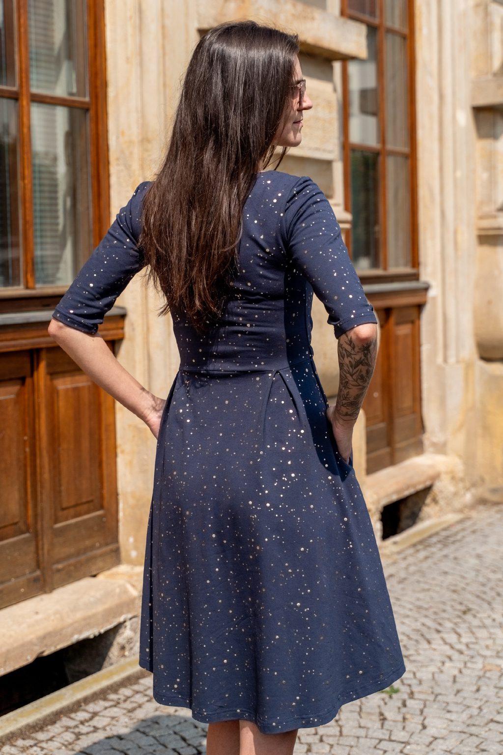 V těchto elegantních šatech budete zářit, ať už v nich vyrazíte na vítání občánků, na ples nebo na romantickou večeři při svíčkách. Tmavě modrá látka posetá zlatými kaňkami připomíná čarovnou noční oblohu plnou hvězd, která předpovídá budoucnost a plní sny. Model se bude nádherně snoubit s jemnými zlatými šperky, které umocní jejich jedinečnost, a vhodným doplňkem může být i decentní zlaté psaníčko. Toužíte být elegantní a tajemná? Tenhle kousek z vás udělá královnu noci! 👑