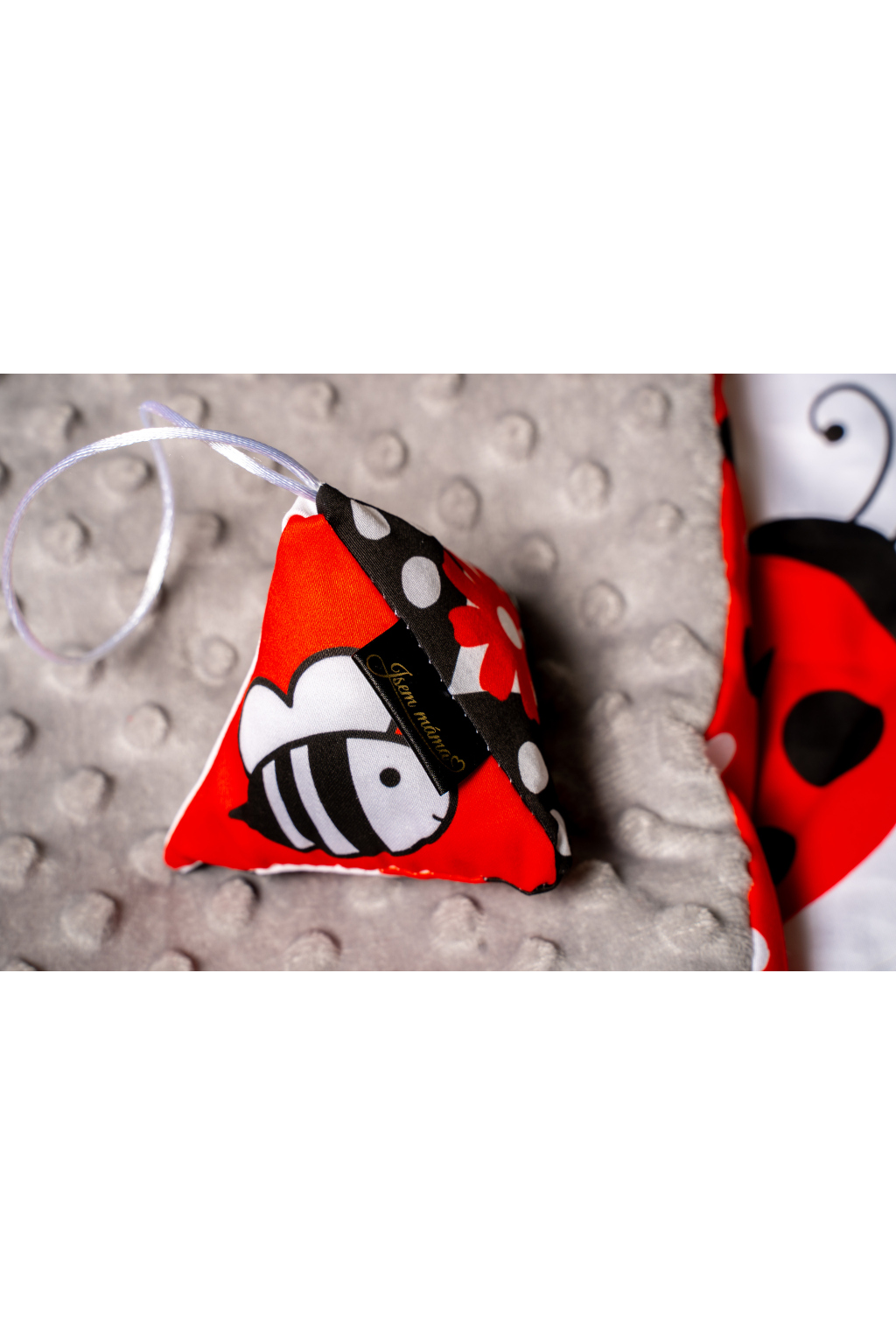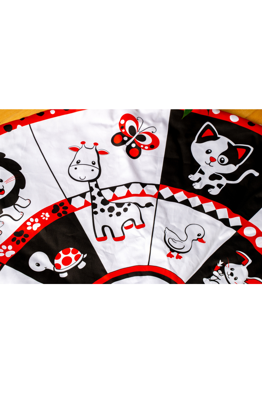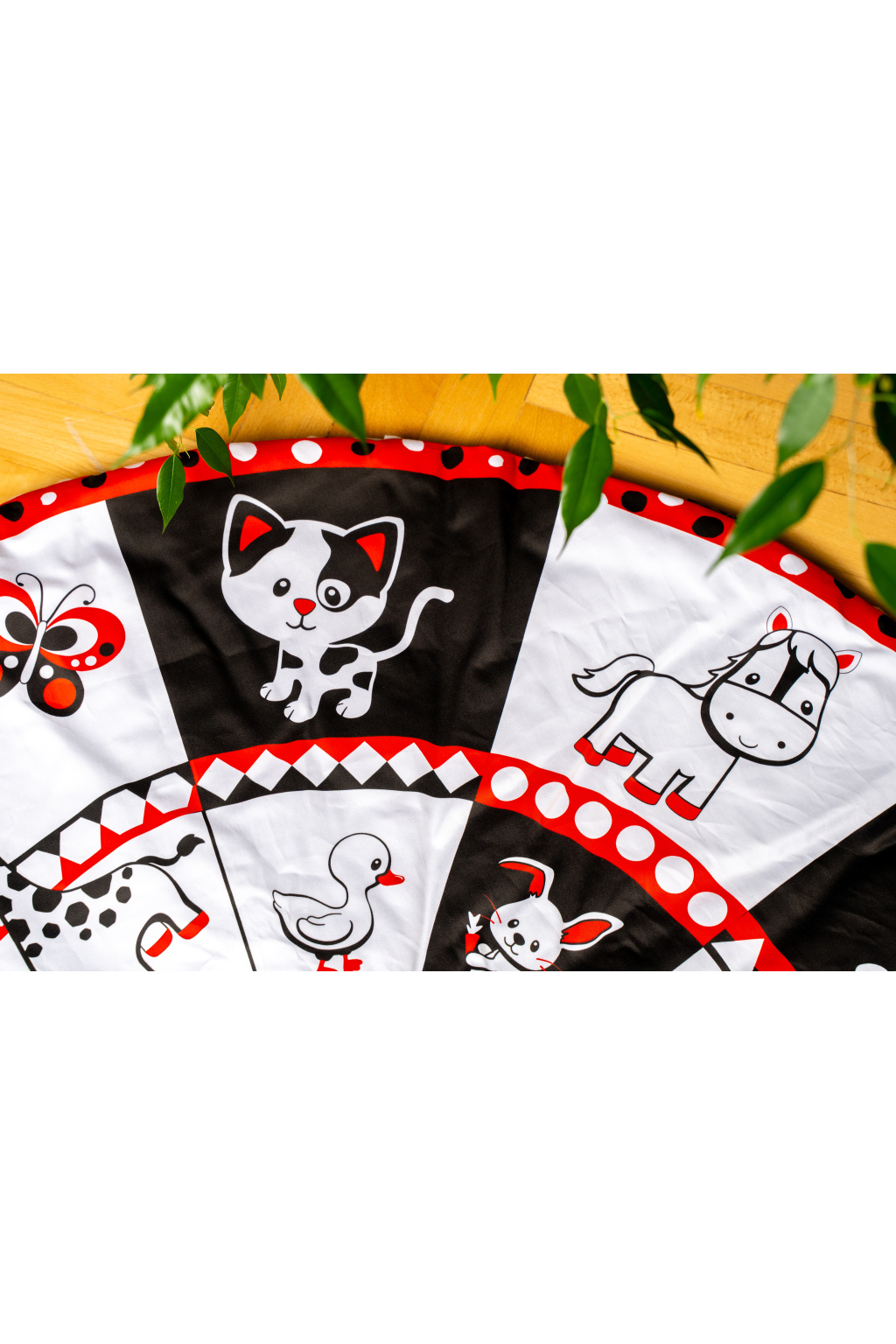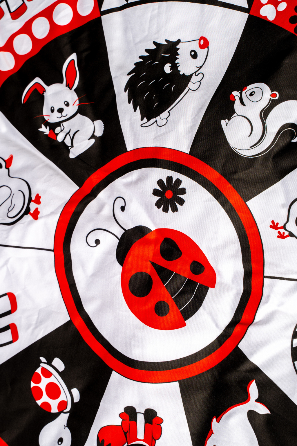 Kruhové uspořádání motivů přirozeně přitahuje pozornost miminka ke středu a postupně ho vede k objevování všech detailů – od puntíkaté berušky až po pichlavého ježečka. Červená zbarvení berušky, kopýtek, zobáčků a dalších prvků oživují černobílý design a vytváří fascinující kontrasty pro zvídavá očička.