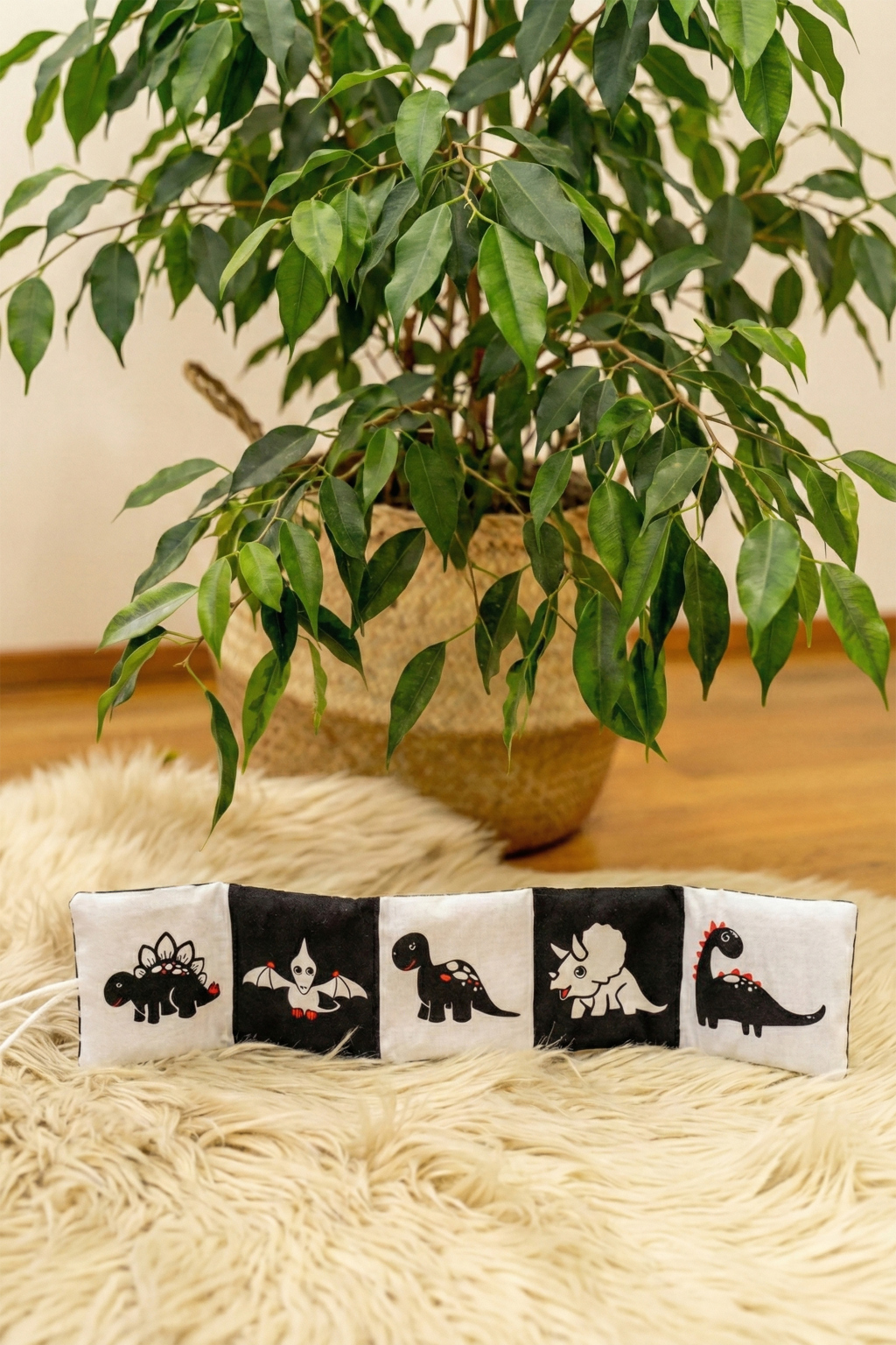 Kontrastní mini látkové leporelo s pěti obrázky je ideální edukační pomůcka od narození vašeho miminka.