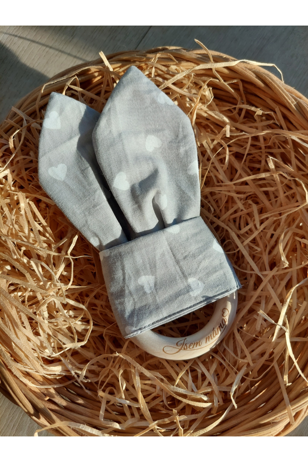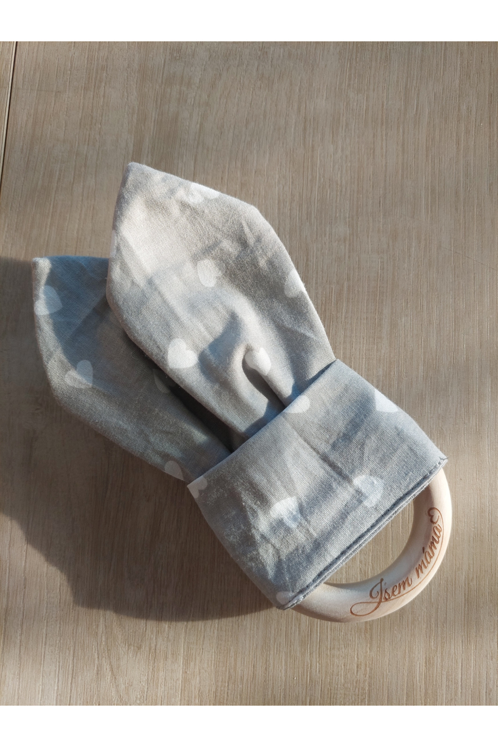 Dřevěný kroužek je vyrobený z kvalitního bukového dřeva bez lakování či jiné úpravy. Šustivá ouška, která šijeme z přírodní bavlny s certifikací OEKO-TEX Standard 100, upoutají pozornost a zájem o hru.