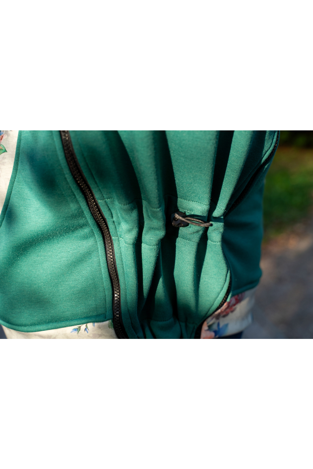 Součástí mikiny je odnímatelná nosicí vsadka, kterou můžete libovolně odepínat a připínat podle toho, jak zrovna potřebujete. Vsadka je designově sladěná s mikinou a navíc je velmi variabilní – její velikost můžete snadno upravovat a měnit pomocí všitých gumiček, které vsadku stáhnou hned na několika místech. Skvěle tak sedne jak malému miminku, tak i dvouletému nošenečkovi.