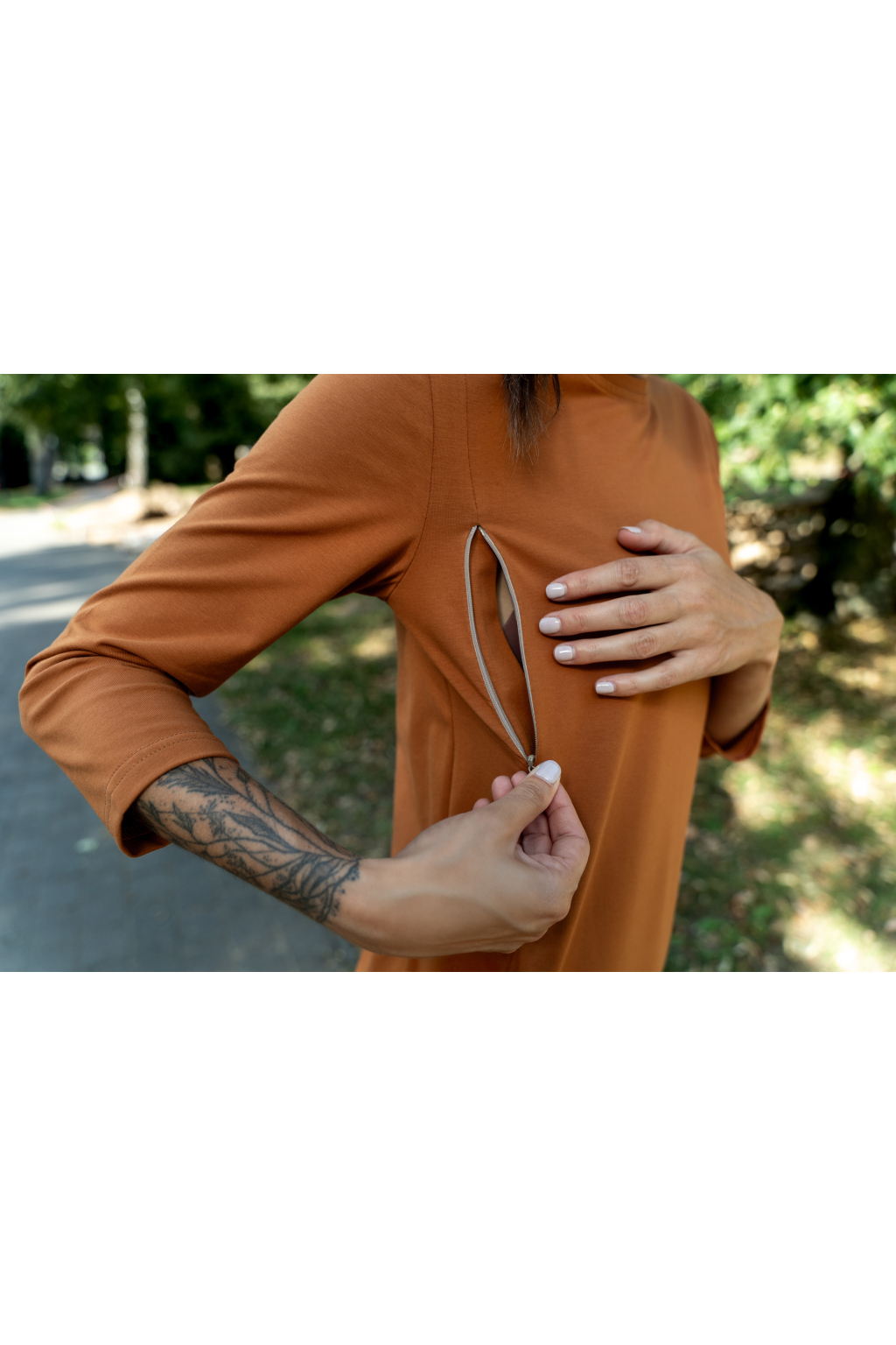 Naše oversize šaty jsou doplněny o kojicí funkci, díky které můžete snadno a pohodlně nakojit své miminko. Kojení vám umožní skryté boční zipy v oblasti prsou. Tuto možnost skvěle využijte také při nošení miminka v šátku či nosítku, ve kterém potřebujete mít pro děťátko snadný přístup k prsu.