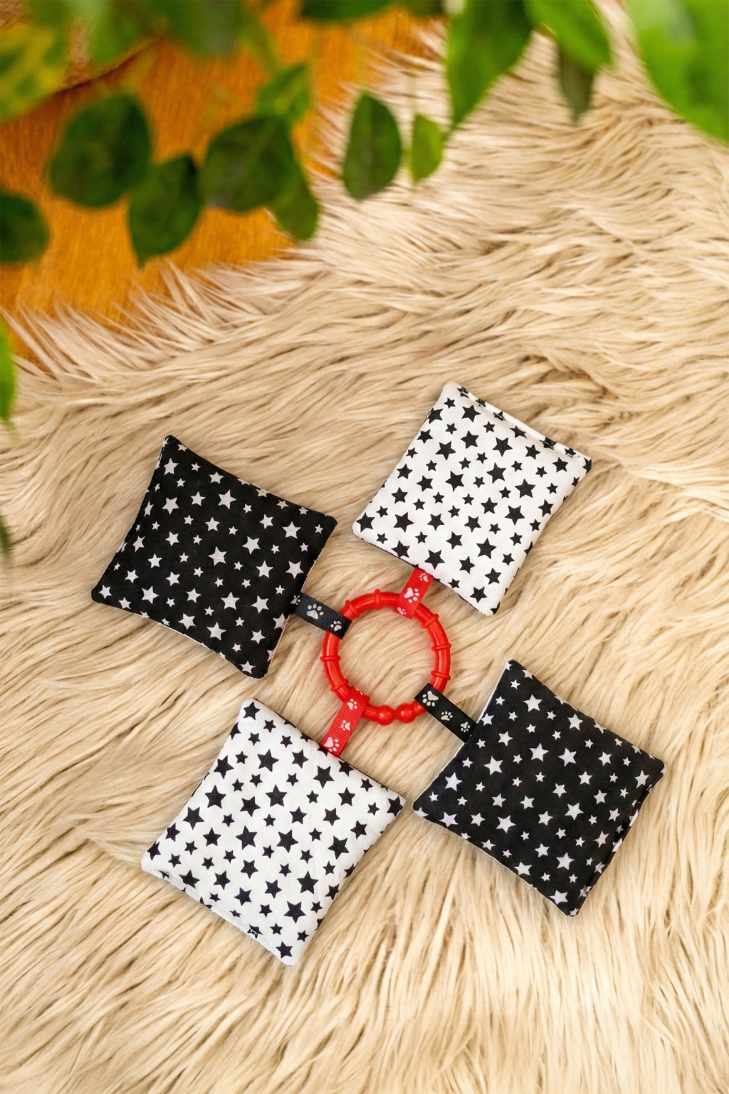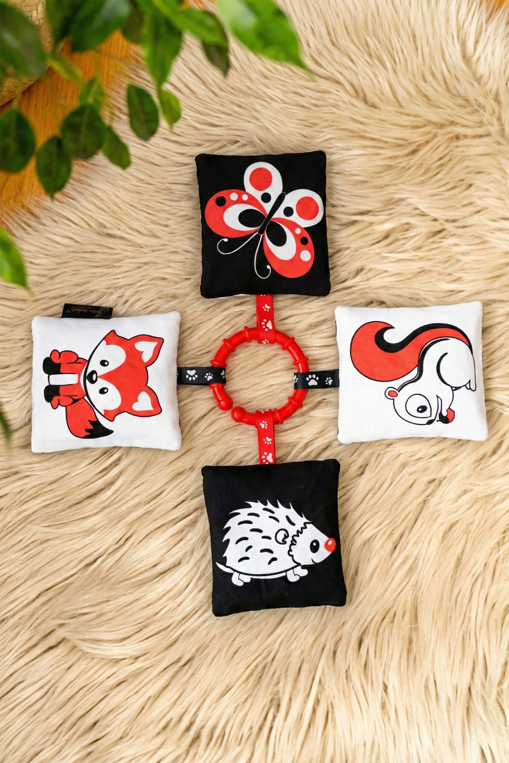 Černo-bílo-červené kartičky zaujmou nejen zrak vašeho miminka, pozornost upoutá také jemný šustivý a cinkací zvuk, který bude děťátko podněcovat k tahání a cumlání. Díky plastovému očku je můžete také zavěsit do postýlky, do kočárku, nebo ponechat miminku jen tak na muchlání.