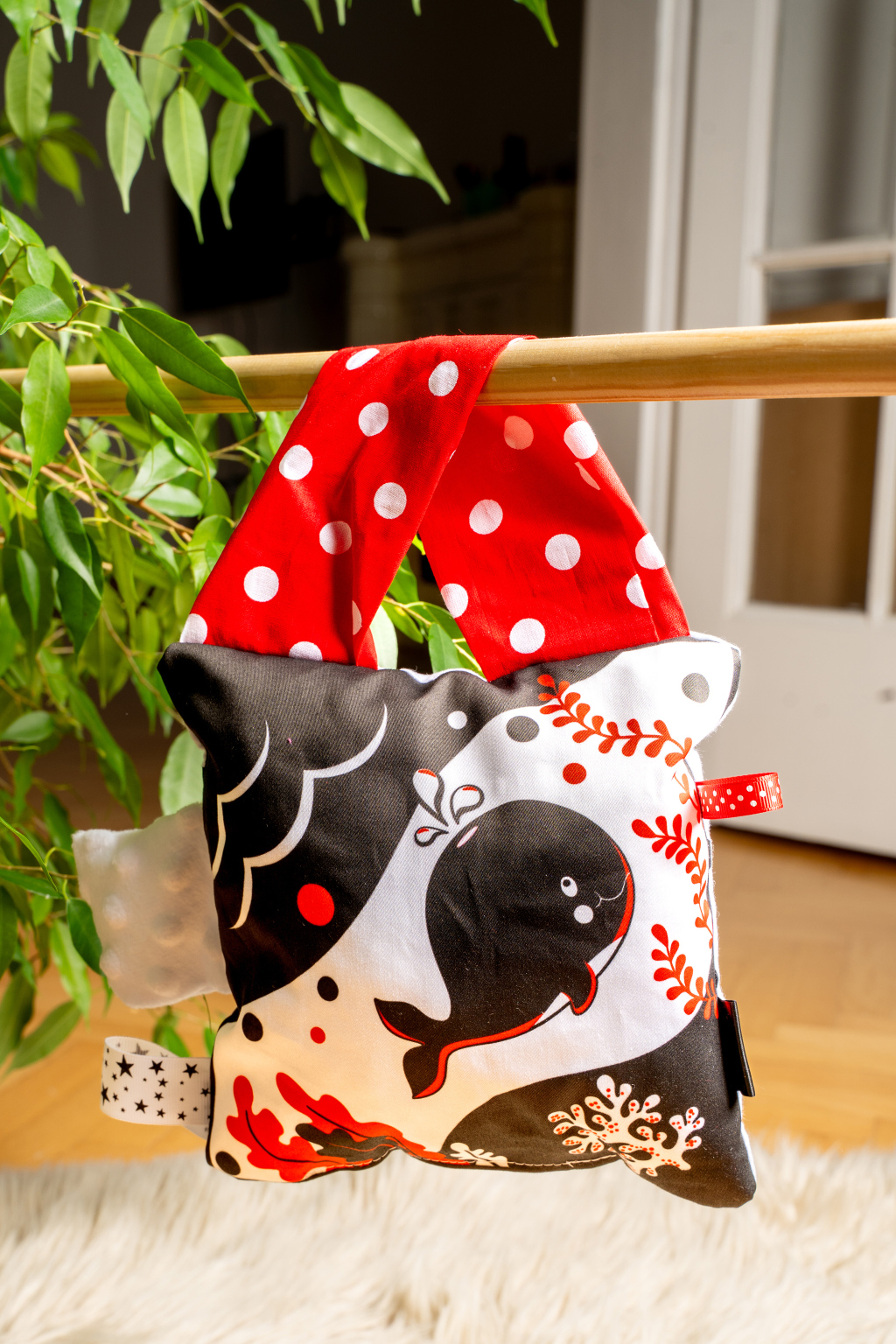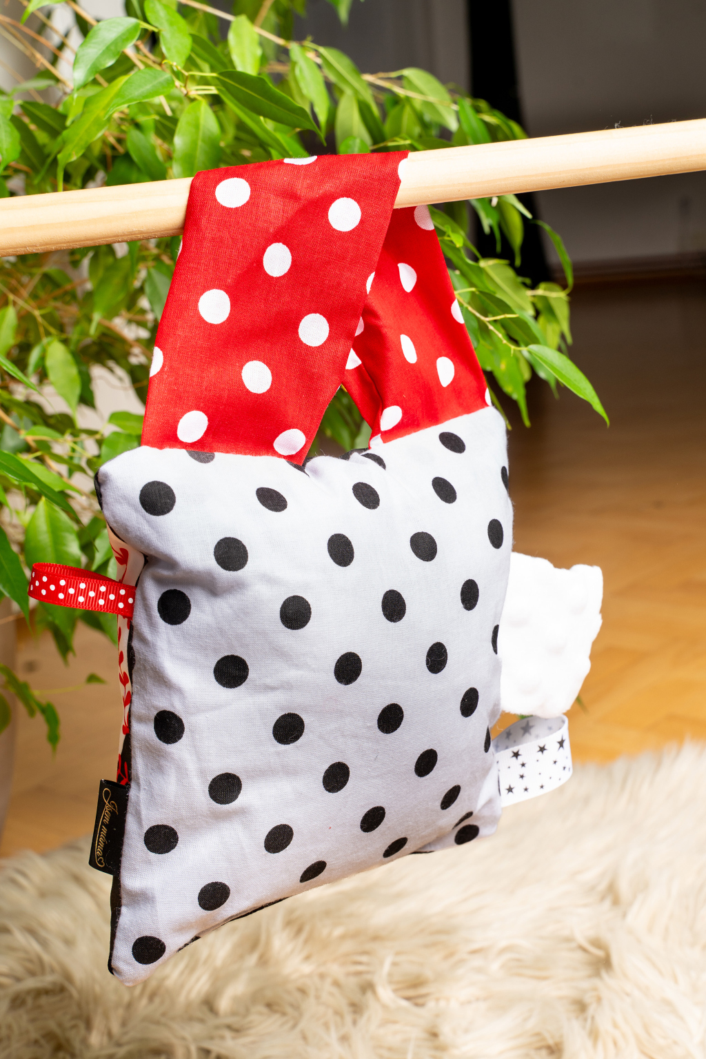 Černo-bílý závěsný polštářek zaujme nejen zrak vašeho miminka, pozornost upoutá také jemný chrastivý i pískací zvuk, který bude děťátko podněcovat k tahání a cumlání. Díky několika hmatovým prvkům po obvodu procvičí úchop, jemnou motoriku a schopnost soustředění. Tato didaktická kontrastní pomůcka se stane příjemným společníkem při usínání. Můžete ji zavěsit do postýlky, do kočárku, nebo ponechat miminku jen tak na muchlání.