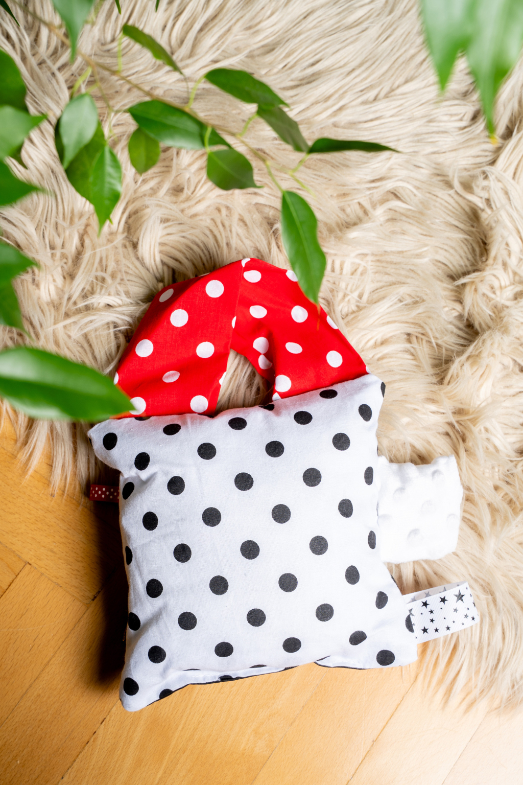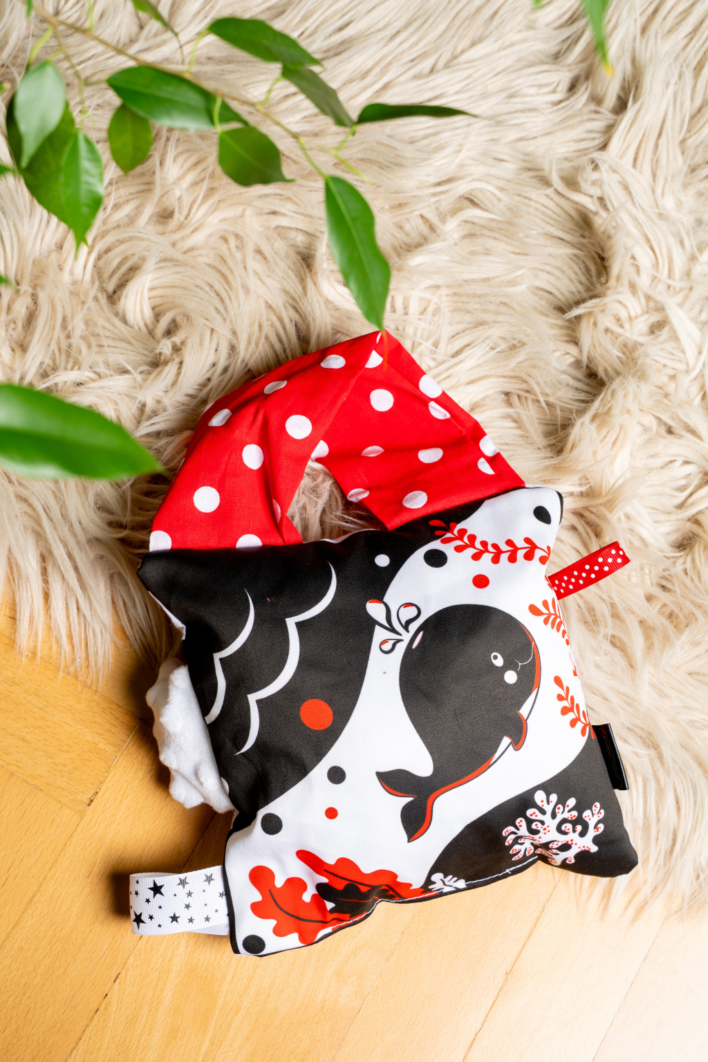 Interaktivní měkký a lehký muchlovací polštářek ve dvou základních barvách rozvíjí zrak i sluch miminka, podporuje přirozenou zvídavost a motoriku.