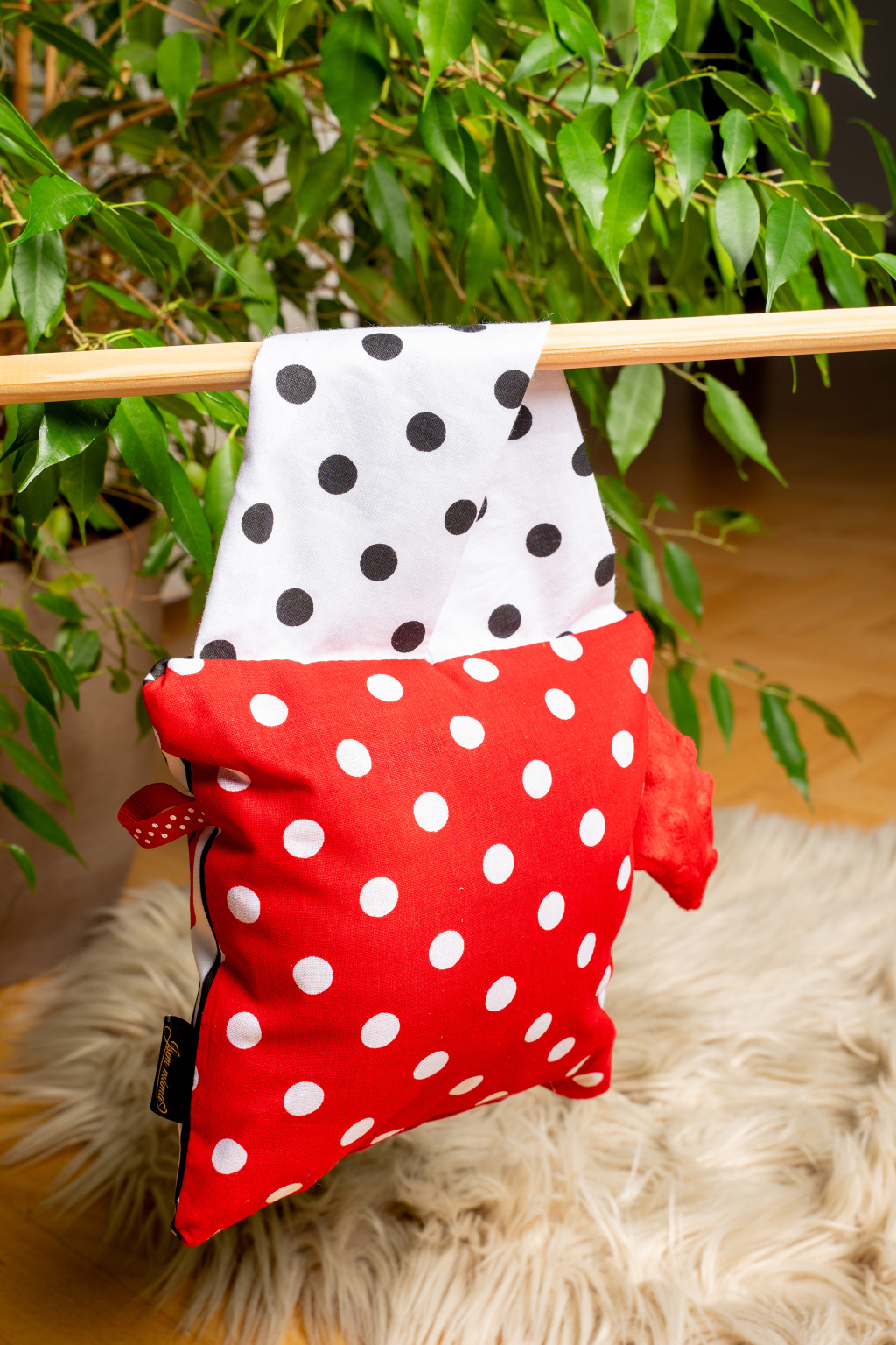Černo-bílý závěsný polštářek zaujme nejen zrak vašeho miminka, pozornost upoutá také jemný chrastivý i pískací zvuk, který bude děťátko podněcovat k tahání a cumlání. Díky několika hmatovým prvkům po obvodu procvičí úchop, jemnou motoriku a schopnost soustředění. Tato didaktická kontrastní pomůcka se stane příjemným společníkem při usínání. Můžete ji zavěsit do postýlky, do kočárku, nebo ponechat miminku jen tak na muchlání.