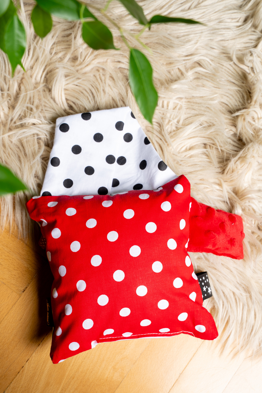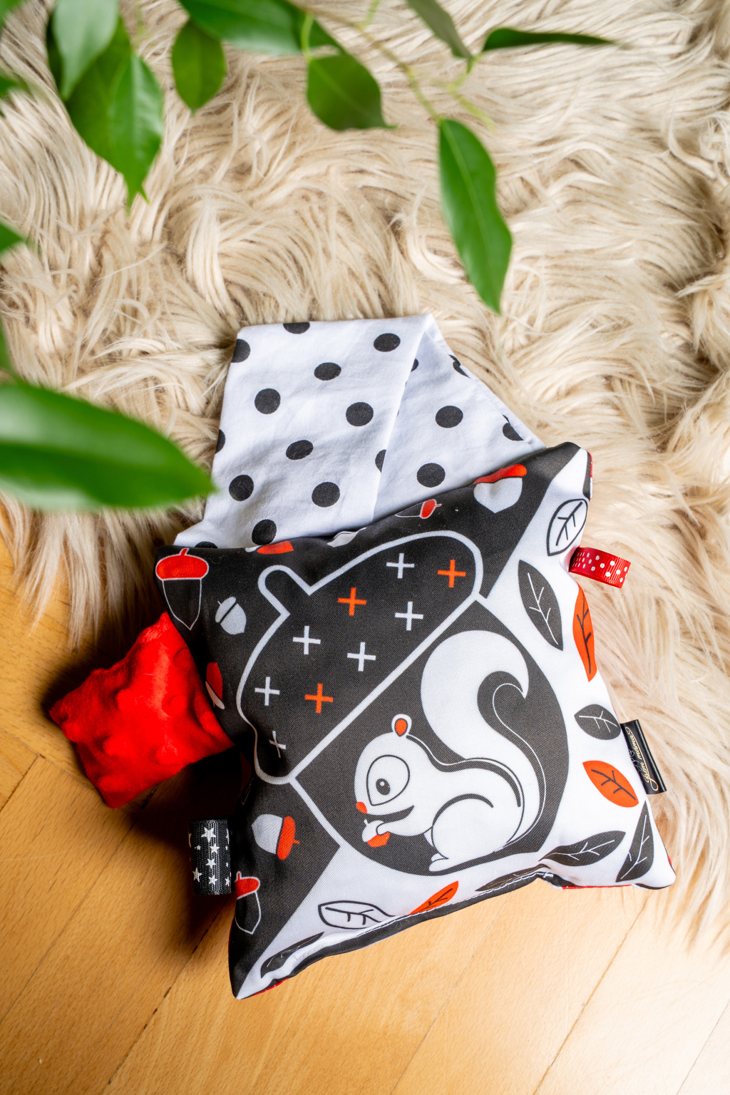 Interaktivní měkký a lehký muchlovací polštářek ve dvou základních barvách rozvíjí zrak i sluch miminka, podporuje přirozenou zvídavost a motoriku.