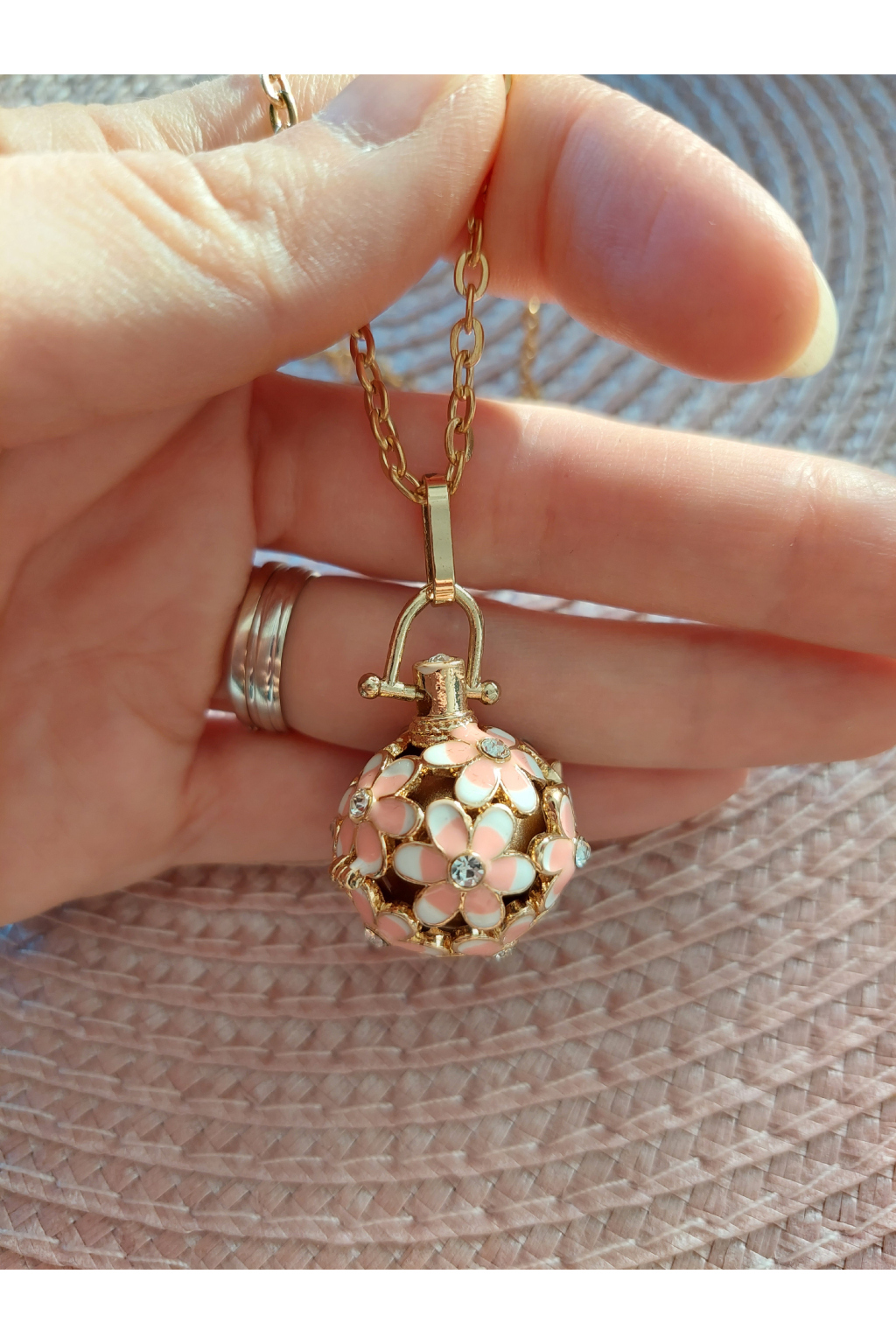 Zároveň k rolničce přidáváme kovový řetízek v klasické délce 70 cm, který využijete po porodu, abyste mohla rolničku pohodlně nosit na krku jako doplněk k vašemu outfitu.