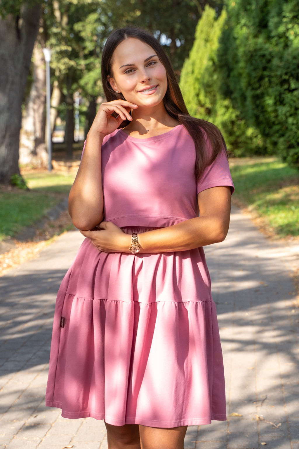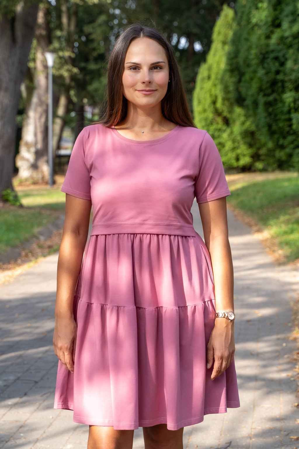 V šatech Rosalia pocítíte dotek kvality. Šijeme je z elastického bavlněného úpletu s mezinárodním certifikátem OEKO-TEX® STANDARD 100, který vylučuje používání nebezpečných látek při výrobě a garantuje nezávadnost materiálu. Bavlna je fantasticky měkká, jemná, hebká na dotek a mimořádně šetrná nejen k vaší, ale i k dětské pokožce.