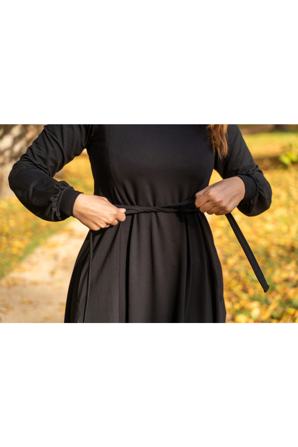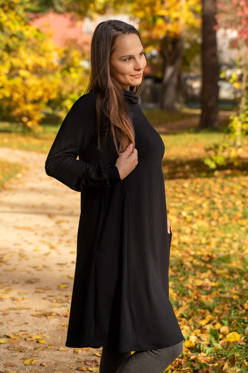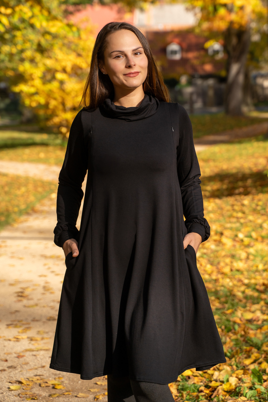 Šaty mají hluboké kapsy skryté ve švech, dlouhé nabírané rukávy s manžetami, elegantní rolák a délku v úrovni kolen – pokud jste vyšší, počítejte s délkou nad kolena, nižším ženám bude sukně sahat níže.