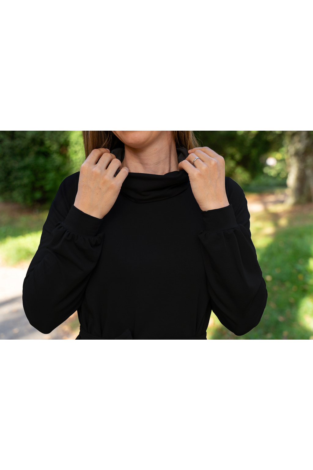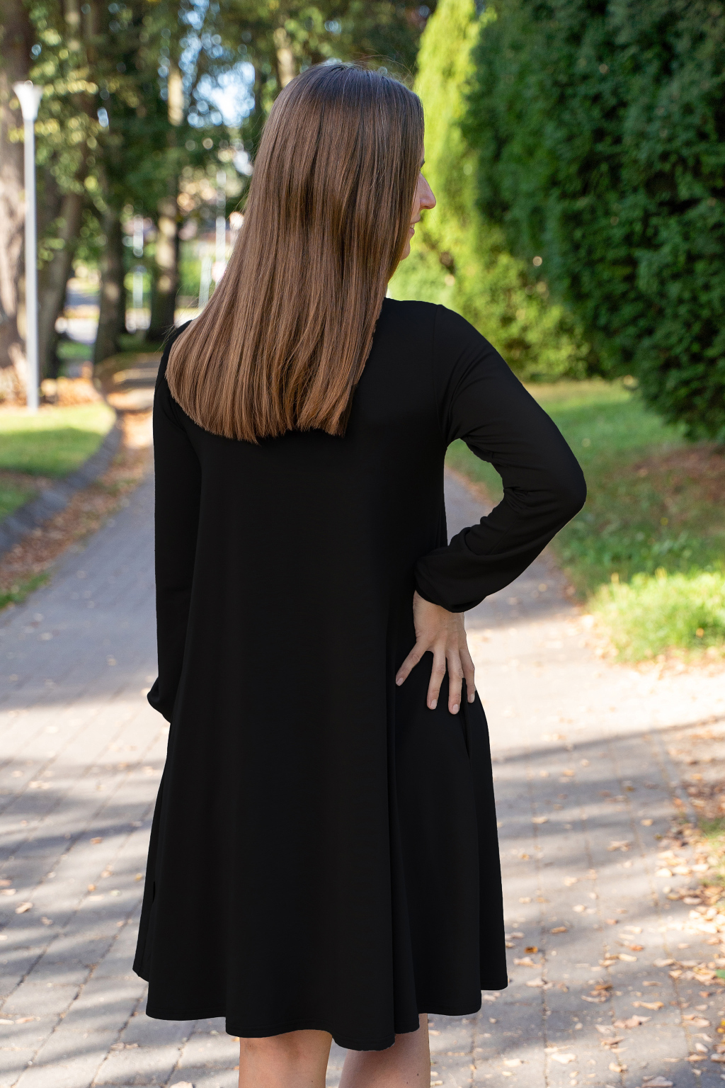 Šaty mají hluboké kapsy skryté ve švech, dlouhé nabírané rukávy s manžetami, elegantní rolák a délku v úrovni kolen – pokud jste vyšší, počítejte s délkou nad kolena, nižším ženám bude sukně sahat níže.