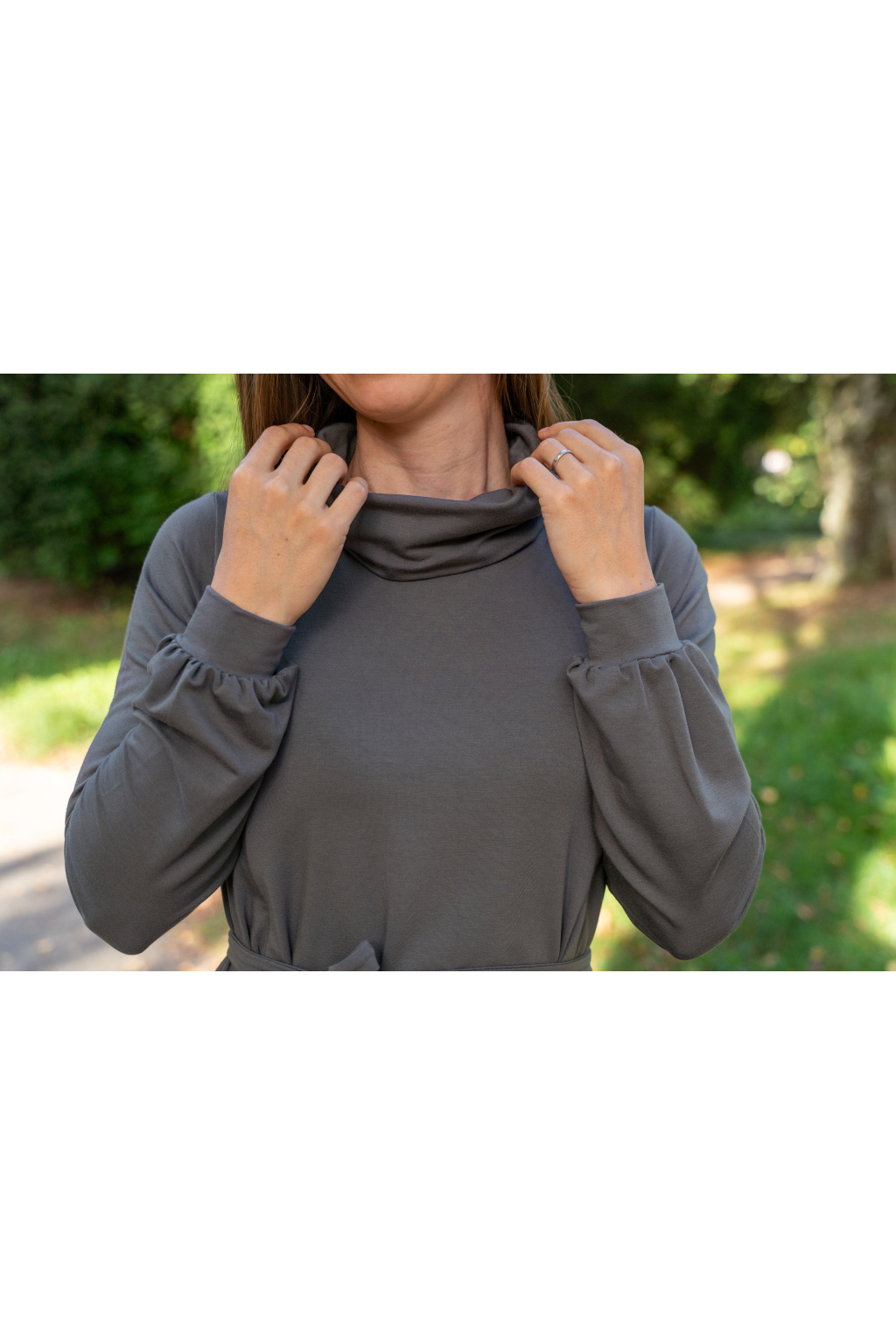 Šaty mají hluboké kapsy skryté ve švech, dlouhé nabírané rukávy s manžetami, elegantní rolák a délku v úrovni kolen – pokud jste vyšší, počítejte s délkou nad kolena, nižším ženám bude sukně sahat níže.