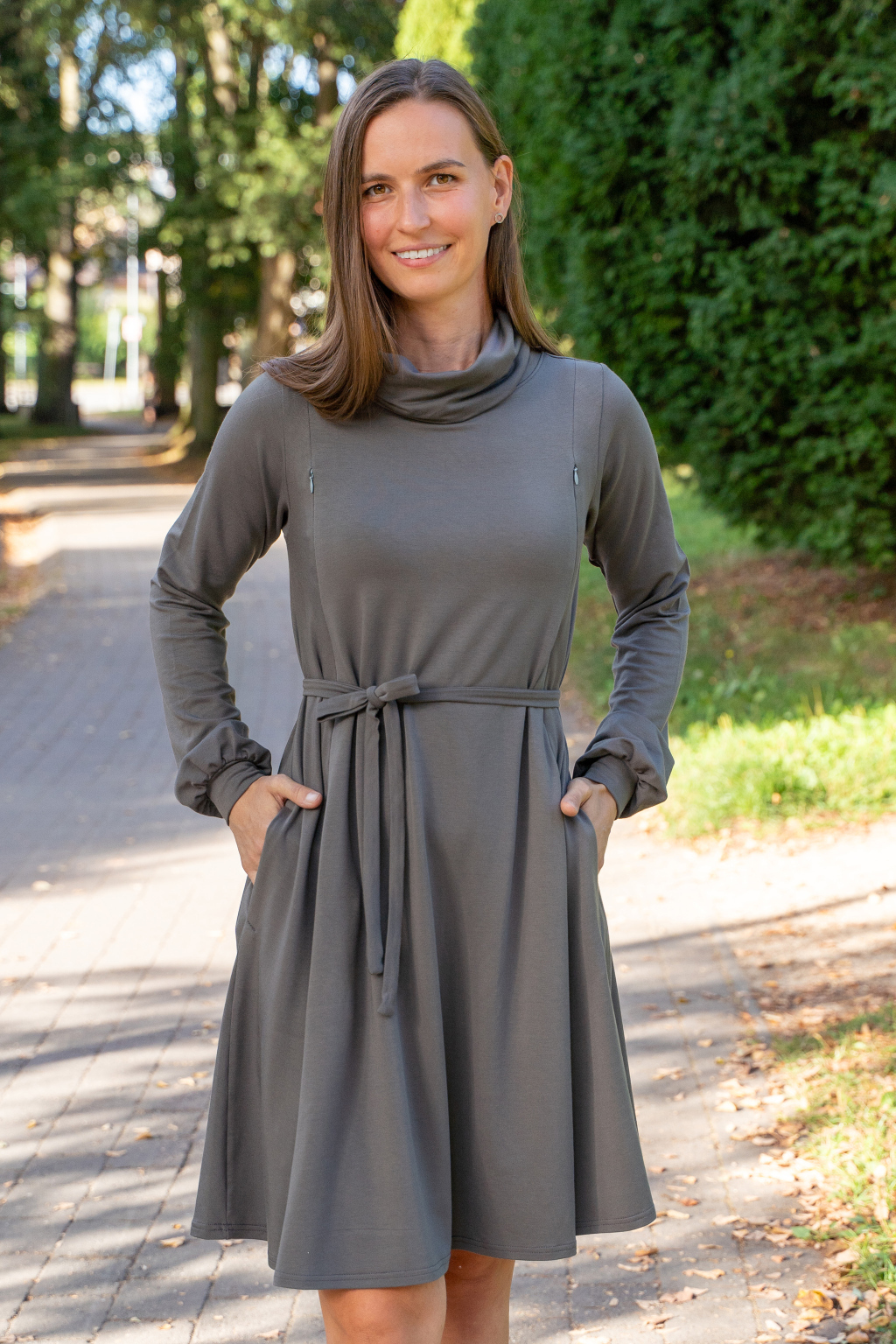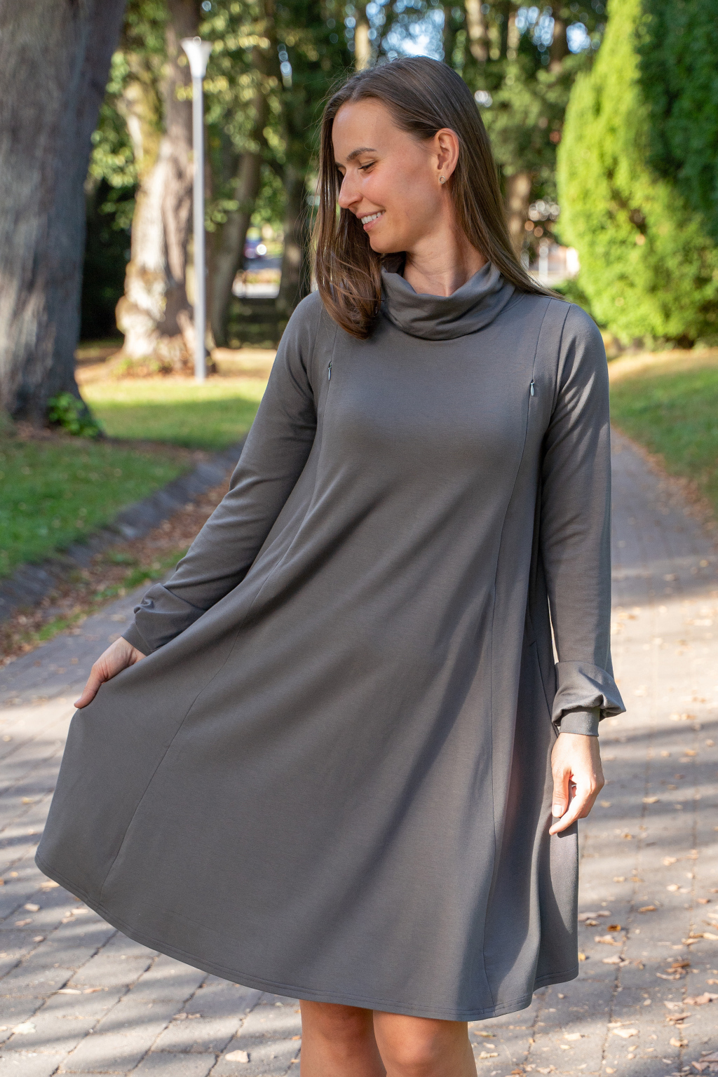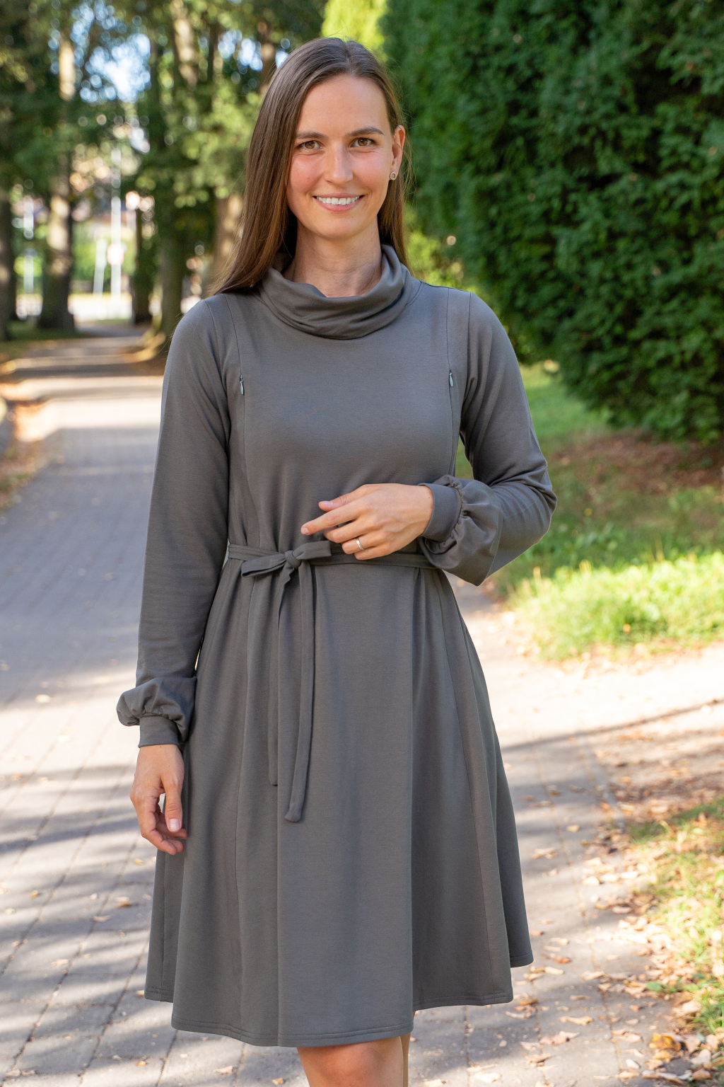 Šaty mají elegantní střih, jsou úžasně pohodlné, podtrhnou, co mají – a zároveň perfektně skryjí případné „nedostatky“. Můžete je nosit na volno jako oversize model, nebo s páskem, který zvýrazní vaši siluetu. Výborně fungují i jako těhotenské a kojicí šaty 2v1. Během těhotenství s přehledem pojmou rostoucí bříško a později v nich své děťátko díky skrytým zipům snadno a diskrétně nakojíte – kdykoli a kdekoli.