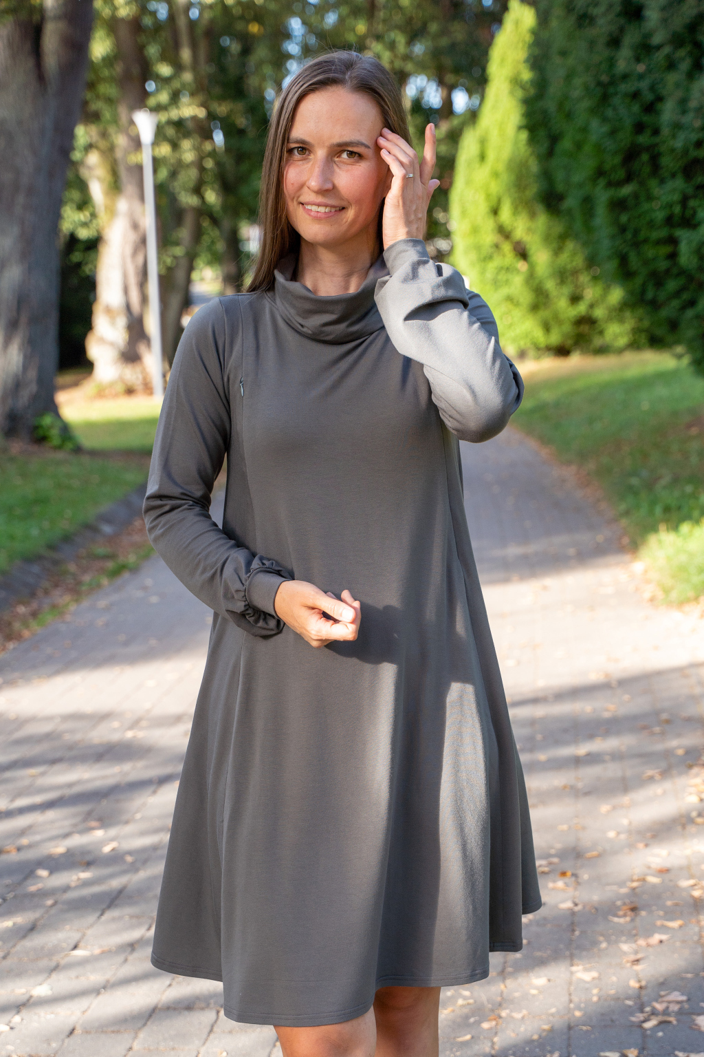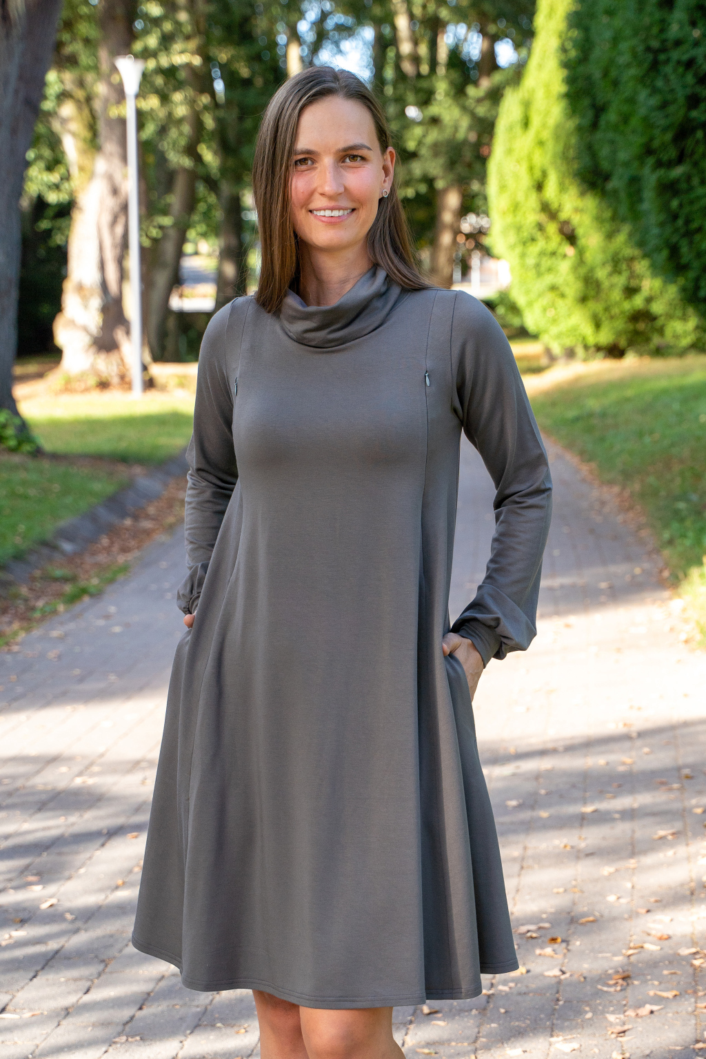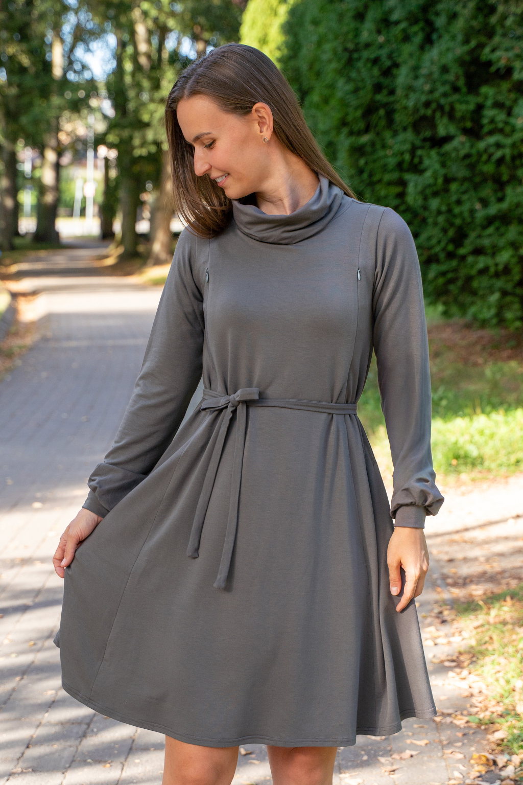 Šaty mají elegantní střih, jsou úžasně pohodlné, podtrhnou, co mají – a zároveň perfektně skryjí případné „nedostatky“. Můžete je nosit na volno jako oversize model, nebo s páskem, který zvýrazní vaši siluetu. Výborně fungují i jako těhotenské a kojicí šaty 2v1. Během těhotenství s přehledem pojmou rostoucí bříško a později v nich své děťátko díky skrytým zipům snadno a diskrétně nakojíte – kdykoli a kdekoli.
