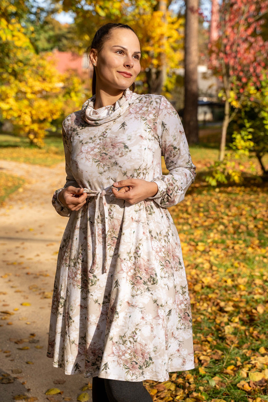 Tyto šaty se nesnaží poutat pozornost – a přesto zanechají dojem. Jemné tóny béžové a šalvějově zelené vytvářejí přírodní harmonii, která podtrhne každý okamžik vašeho dne. V šatech s tímto vzorem se budete cítit elegantně – a zároveň zůstanete sama sebou. Hodí se ke krémovým, hnědým či olivovým doplňkům, krásně ladí s vlnou, kůží i hrubým pleteným šálem. Pokud máte ráda klidné odstíny, které zaujmou, ale nekřičí – tento květovaný kousek je přesně pro vás.