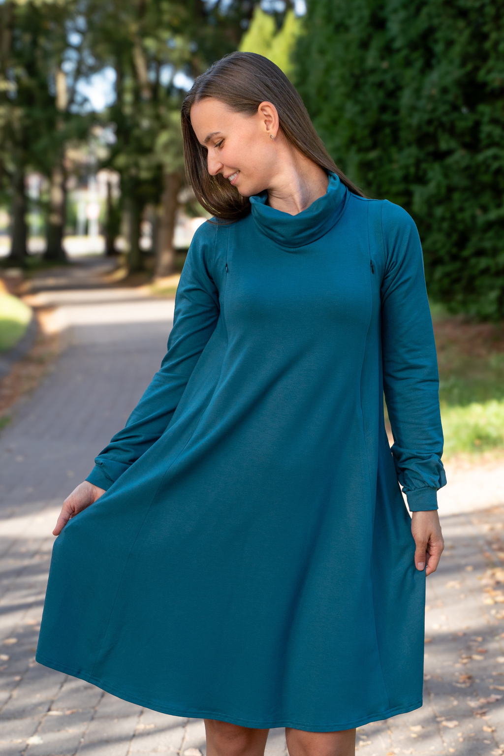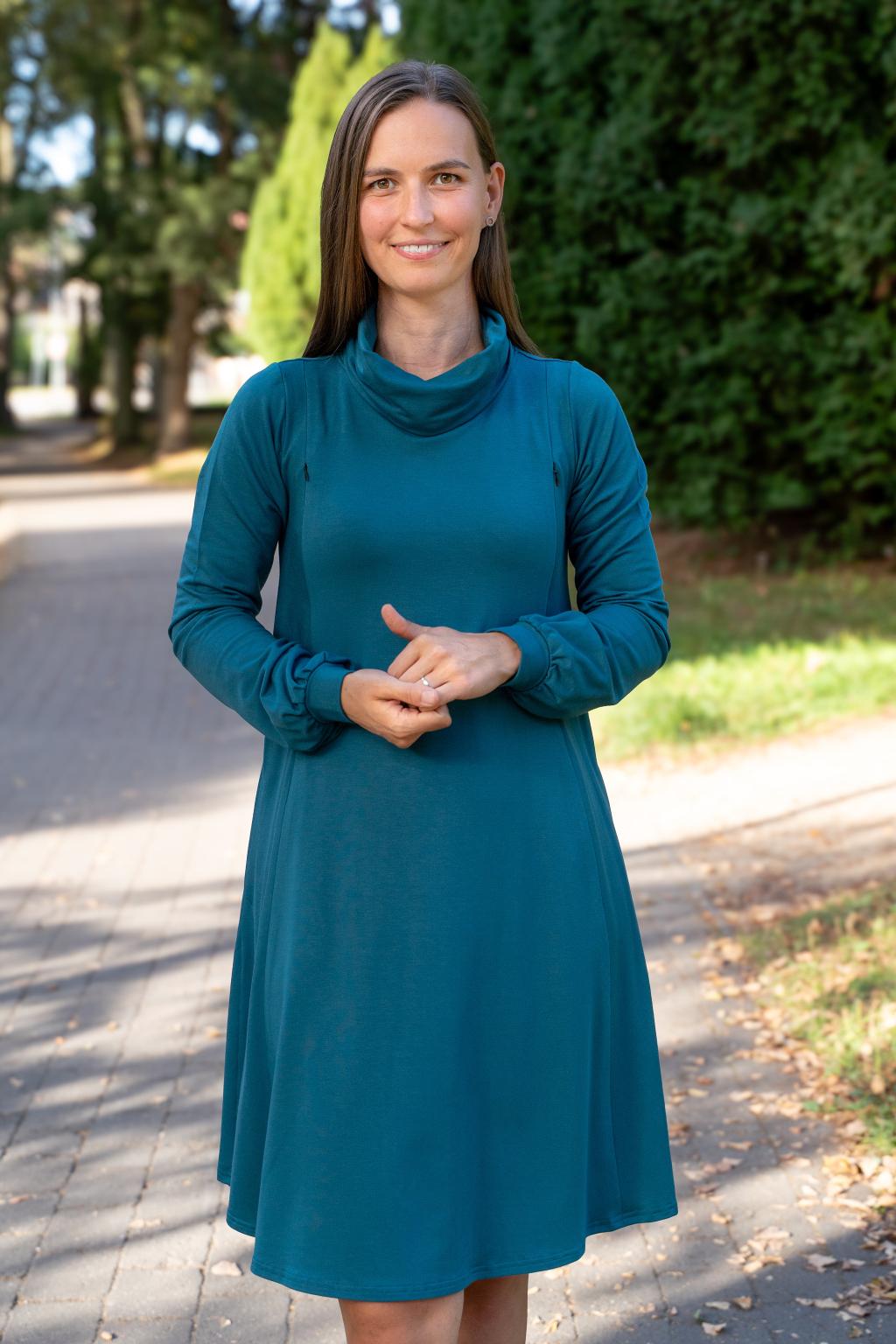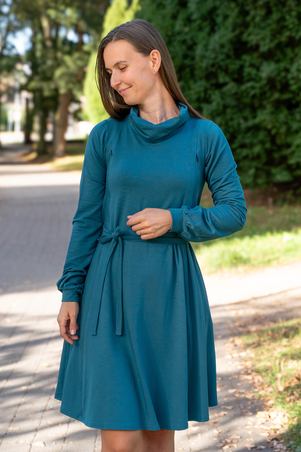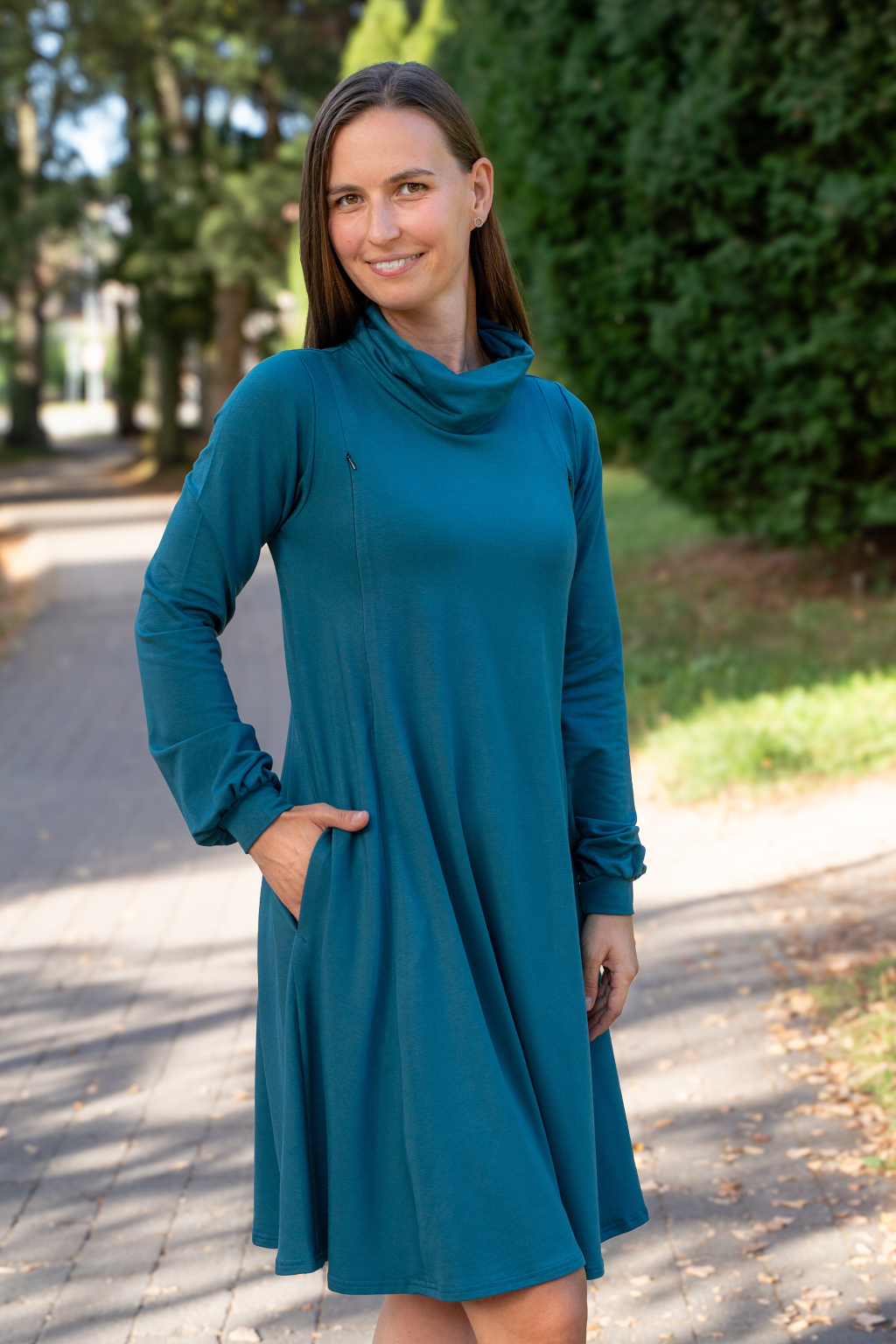 Zimní bambusové kojicí šaty se skrytými zipy – petrolejové