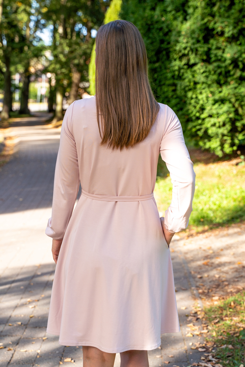 Šaty mají hluboké kapsy skryté ve švech, dlouhé nabírané rukávy s manžetami, elegantní rolák a délku v úrovni kolen – pokud jste vyšší, počítejte s délkou nad kolena, nižším ženám bude sukně sahat níže.