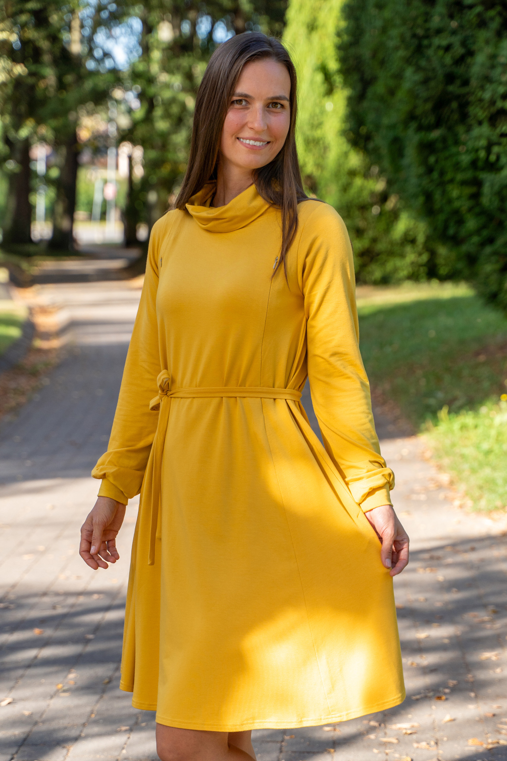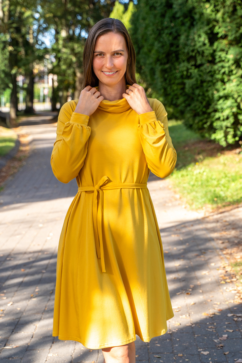 Šaty mají hluboké kapsy skryté ve švech, dlouhé nabírané rukávy s manžetami, elegantní rolák a délku v úrovni kolen – pokud jste vyšší, počítejte s délkou nad kolena, nižším ženám bude sukně sahat níže.