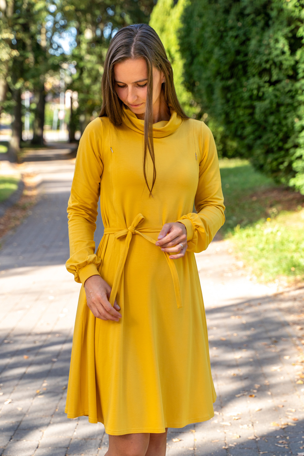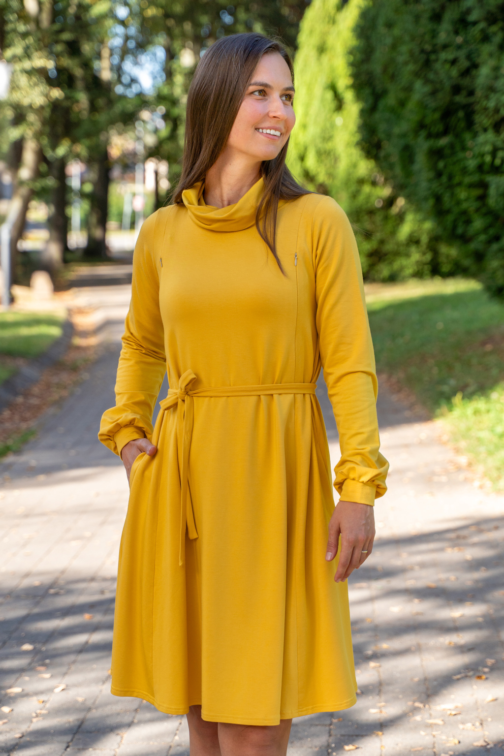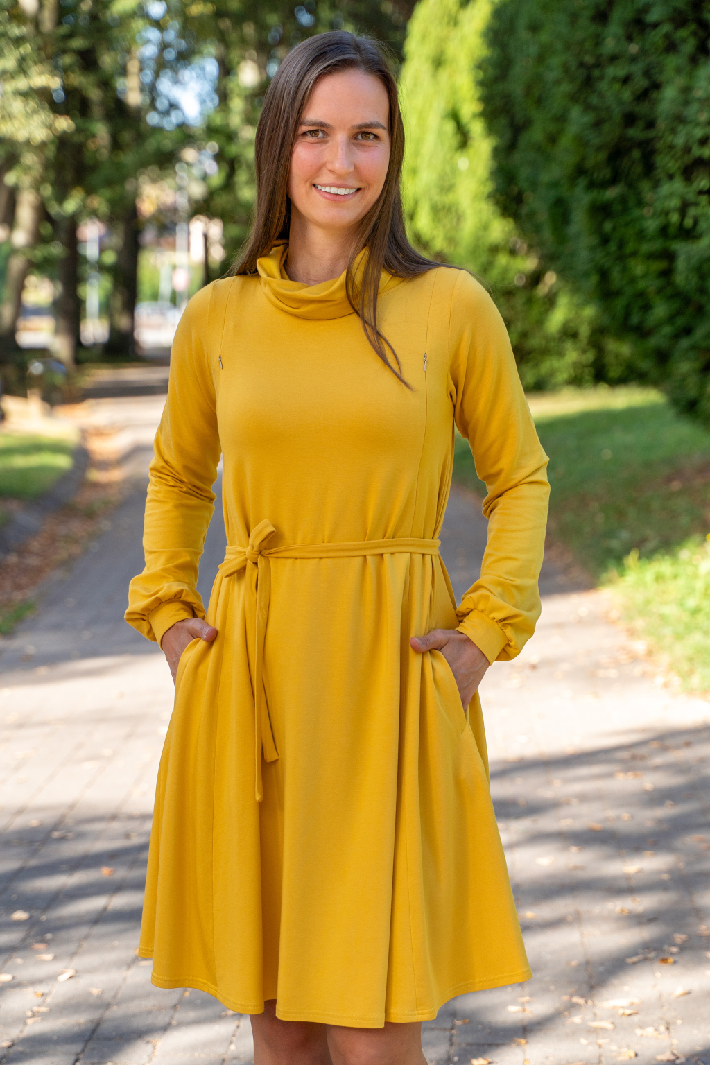 Zimní bambusové kojicí šaty se skrytými zipy – slunečnicově žluté