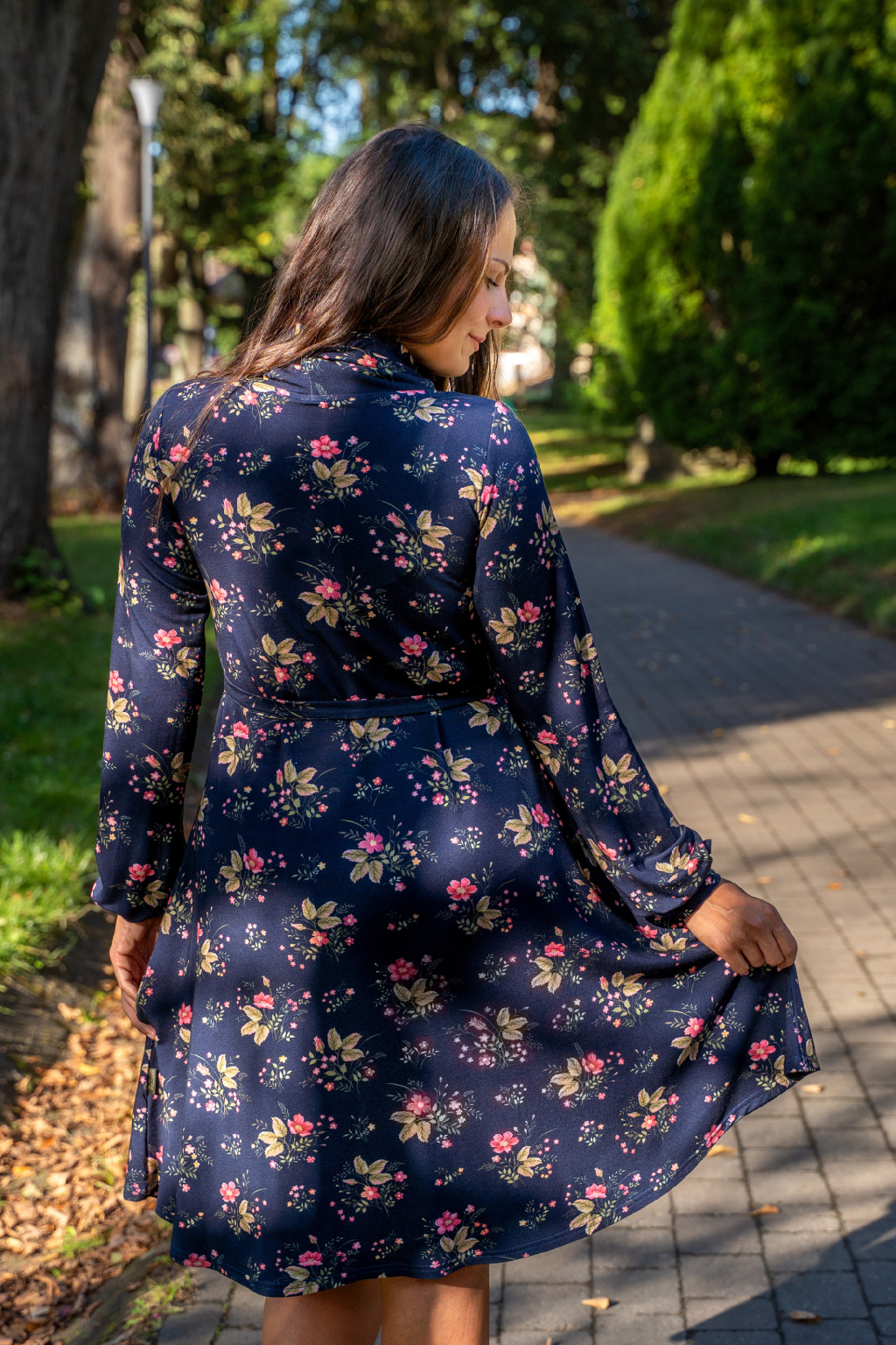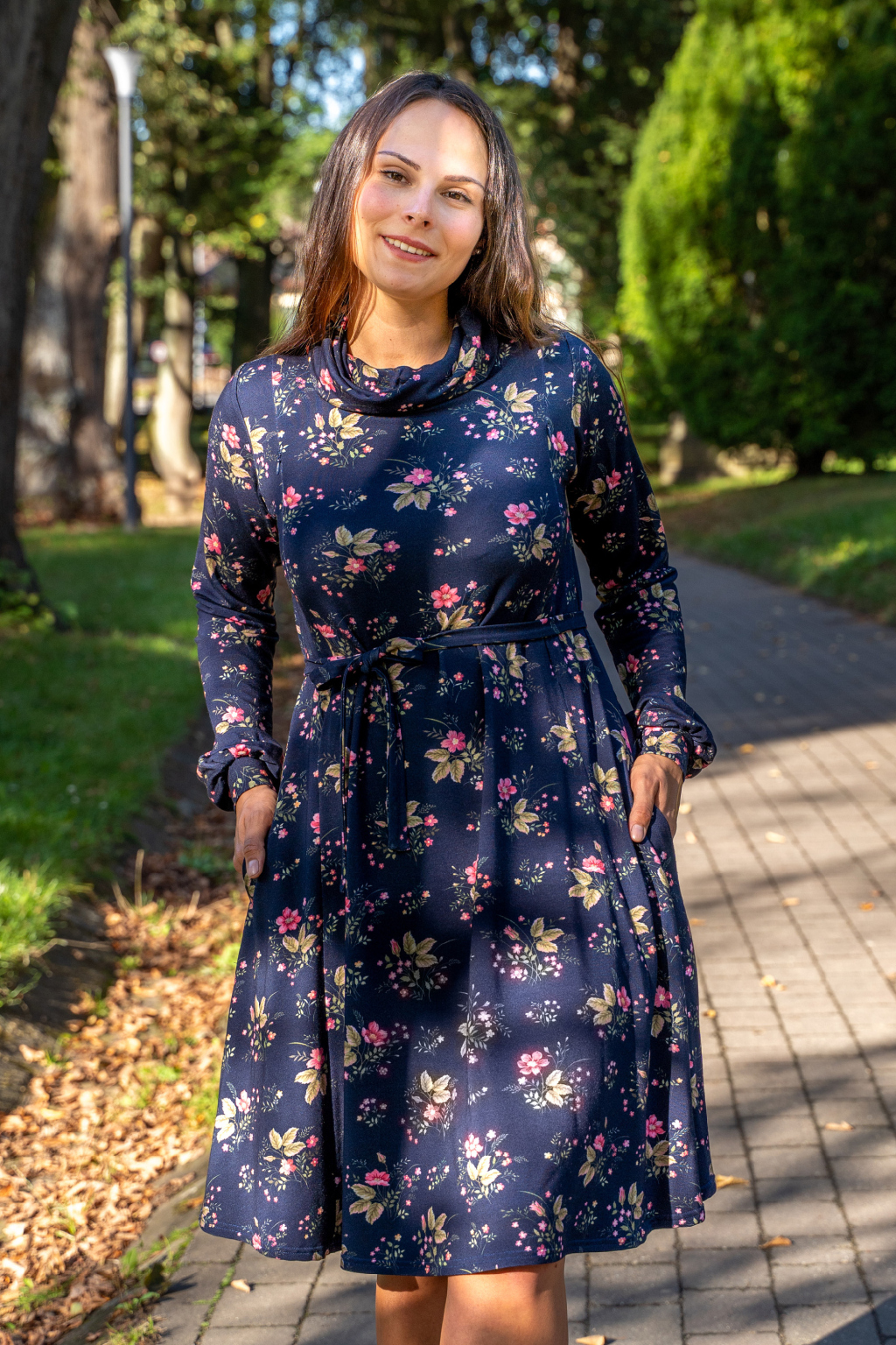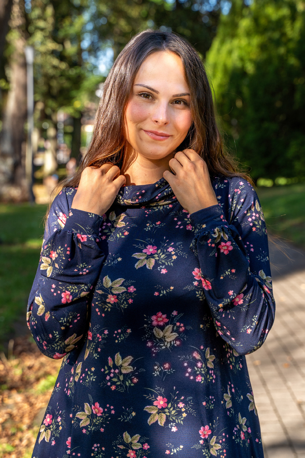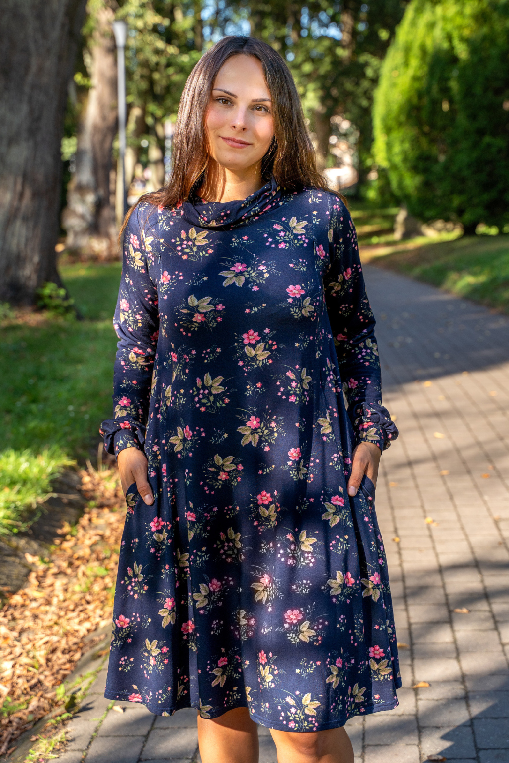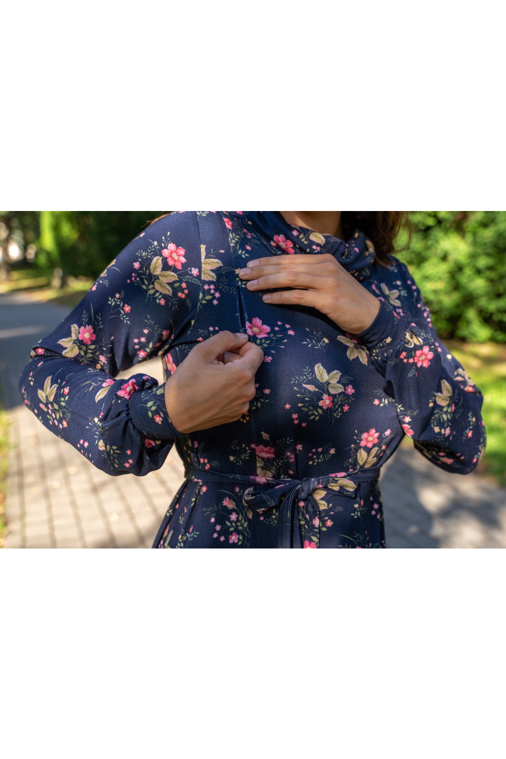 Zimní bambusové kojicí šaty se skrytými zipy – tmavě modré s kvítky