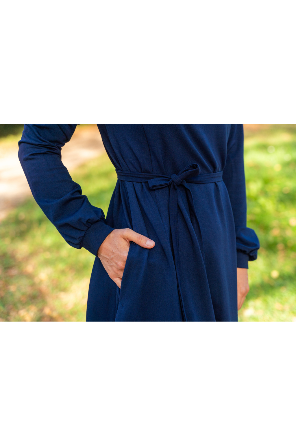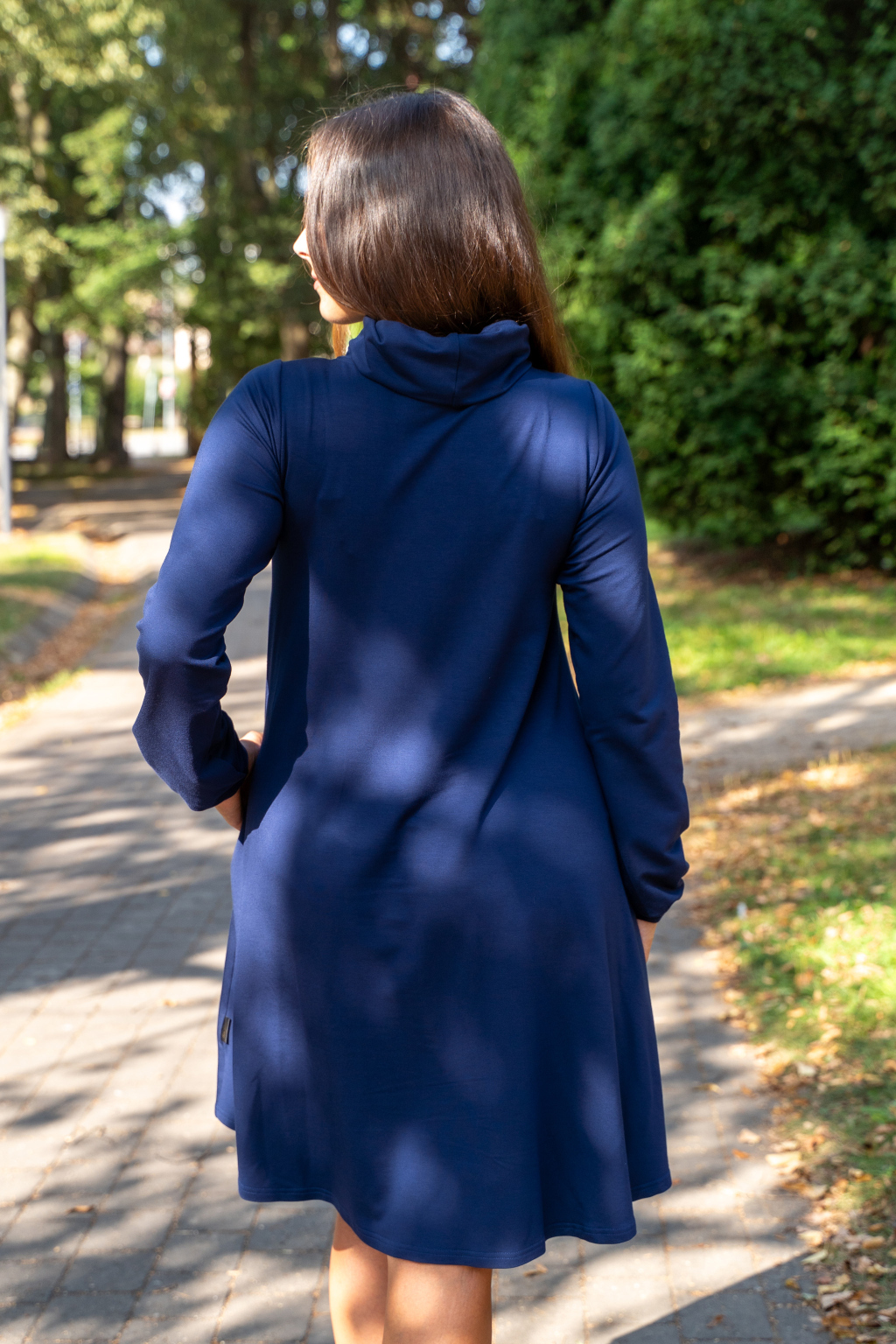 Šaty mají hluboké kapsy skryté ve švech, dlouhé nabírané rukávy s manžetami, elegantní rolák a délku v úrovni kolen – pokud jste vyšší, počítejte s délkou nad kolena, nižším ženám bude sukně sahat níže.